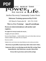 Wednesdays & Fridays, 3-4 pm Anchor Recovery Community Center 249 Main Street, Pawtucket, RI 02860 401-721-5100