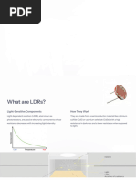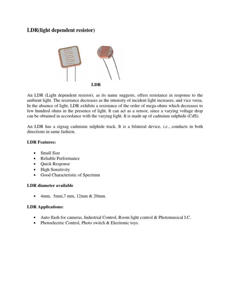 LDR An LDR (Light dependent resistor), as its name suggests, offers resistance in response to the ambient light. The resistance decreases as the intensity of incident light increases, and vice versa. In the absence of light, LDR exhibits a resistance of the order of mega-ohms which decreases to few hundred ohms in the presence of light. It can act as a sensor, since a varying voltage drop can be obtained in accordance with the varying light. It is made up of cadmium sulphide (CdS). An LDR has a zigzag cadmium sulphide track. It is a bilateral device, i.e., conducts in both directions in same fashion. LDR Features: Small Size Reliable Performance Quick Response High Sensitivity Good Characteristic of Spectrum