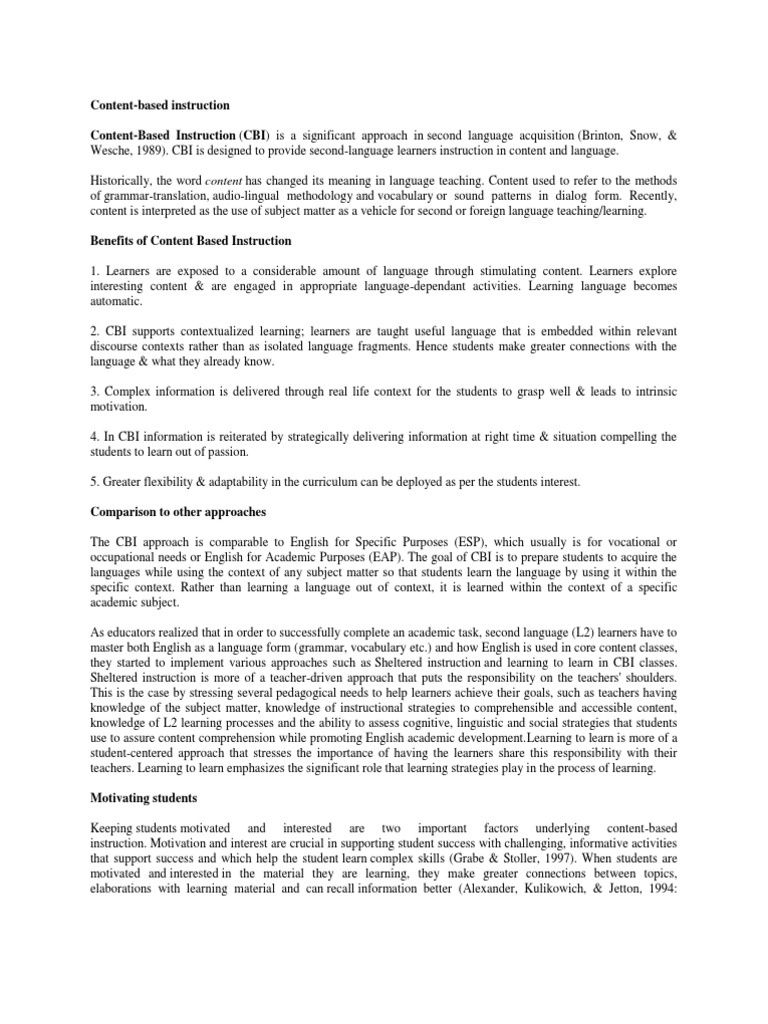 CBI is designed to provide second-language learners instruction in content and language. Historically, the word content has changed its meaning in language teaching. Content used to refer to the methods of grammar-translation, audio-lingual methodology and vocabulary or sound patterns in dialog form. Recently, content is interpreted as the use of subject matter as a vehicle for second or foreign language teaching/learning. Benefits of Content Based Instruction 1. Learners are exposed to a considerable amount of language through stimulating content. Learners explore interesting content & are engaged in appropriate language-dependant activities. Learning language becomes automatic. 2. CBI supports contextualized learning; learners are taught useful language that is embedded within relevant discourse contexts rather than as isolated language fragments. Hence students make greater connections with the language & what they already know. 3. Complex information is delivered through real life context for the students to grasp well & leads to intrinsic motivation. 4. In CBI information is reiterated by strategically delivering information at right time & situation compelling the students to learn out of passion. 5. Greater flexibility & adaptability in the curriculum can be deployed as per the students interest. Comparison to other approaches The CBI approach is comparable to English for Specific Purposes (ESP), which usually is for vocational or occupational needs or English for Academic Purposes (EAP). The goal of CBI is to prepare students to acquire the languages while using the context of any subject matter so that students learn the language by using it within the specific context. Rather than learning a language out of context, it is learned within the context of a specific academic subject. As educators realized that in order to successfully complete an academic task, second language (L2) learners have to master both English as a language form (grammar, vocabulary etc.) and how English is used in core content classes, they started to implement various approaches such as Sheltered instruction and learning to learn in CBI classes. Sheltered instruction is more of a teacher-driven approach that puts the responsibility on the teachers' shoulders. This is the case by stressing several pedagogical needs to help learners achieve their goals, such as teachers having knowledge of the subject matter, knowledge of instructional strategies to comprehensible and accessible content, knowledge of L2 learning processes and the ability to assess cognitive, linguistic and social strategies that students use to assure content comprehension while promoting English academic [Link] to learn is more of a student-centered approach that stresses the importance of having the learners share this responsibility with their teachers. Learning to learn emphasizes the significant role that learning strategies play in the process of learning. Motivating students Keeping students motivated and interested are two important factors underlying content-based instruction. Motivation and interest are crucial in supporting student success with challenging, informative activities that support success and which help the student learn complex skills (Grabe & Stoller, 1997). When students are motivated and interested in the material they are learning, they make greater connections between topics, elaborations with learning material and can recall information better (Alexander, Kulikowich, & Jetton, 1994: