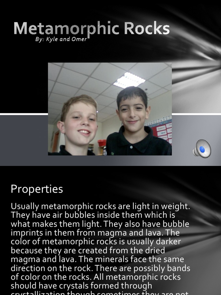 Usually metamorphic rocks are light in weight. They have air bubbles inside them which is what makes them light. They also have bubble imprints in them from magma and lava. The color of metamorphic rocks is usually darker because they are created from the dried magma and lava. The minerals face the same direction on the rock. There are possibly bands of color on the rocks. All metamorphic rocks should have crystals formed through crystallization though sometimes they are not always visible upon observation.