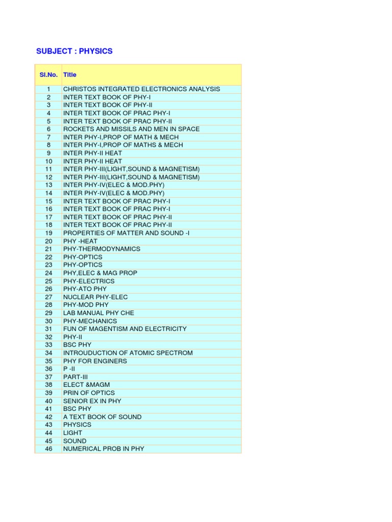 [Link]. Title 1 2 3 4 5 6 7 8 9 10 11 12 13 14 15 16 17 18 19 20 21 22 23 24 25 26 27 28 29 30 31 32 33 34 35 36 37 38 39 40 41 42 43 44 45 46 CHRISTOS INTEGRATED ELECTRONICS ANALYSIS INTER TEXT BOOK OF PHY-I INTER TEXT BOOK OF PHY-II INTER TEXT BOOK OF PRAC PHY-I INTER TEXT BOOK OF PRAC PHY-II ROCKETS AND MISSILS AND MEN IN SPACE INTER PHY-I,PROP OF MATH & MECH INTER PHY-I,PROP OF MATHS & MECH INTER PHY-II HEAT INTER PHY-II HEAT INTER PHY-III(LIGHT,SOUND & MAGNETISM) INTER PHY-III(LIGHT,SOUND & MAGNETISM) INTER PHY-IV(ELEC & [Link]) INTER PHY-IV(ELEC & [Link]) INTER TEXT BOOK OF PRAC PHY-I INTER TEXT BOOK OF PRAC PHY-I INTER TEXT BOOK OF PRAC PHY-II INTER TEXT BOOK OF PRAC PHY-II PROPERTIES OF MATTER AND SOUND -I PHY -HEAT PHY-THERMODYNAMICS PHY-OPTICS PHY-OPTICS PHY,ELEC & MAG PROP PHY-ELECTRICS PHY-ATO PHY NUCLEAR PHY-ELEC PHY-MOD PHY LAB MANUAL PHY CHE PHY-MECHANICS FUN OF MAGENTISM AND ELECTRICITY PHY-II BSC PHY INTROUDUCTION OF ATOMIC SPECTROM PHY FOR ENGINERS P -II PART-III ELECT &MAGM PRIN OF OPTICS SENIOR EX IN PHY BSC PHY A TEXT BOOK OF SOUND PHYSICS LIGHT SOUND NUMERICAL PROB IN PHY