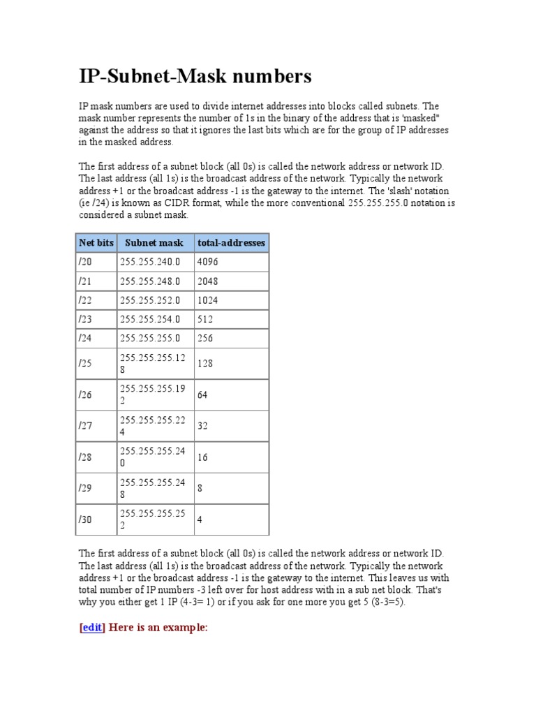 IP mask numbers are used to divide internet addresses into blocks called subnets. The mask number represents the number of 1s in the binary of the address that is 'masked" against the address so that it ignores the last bits which are for the group of IP addresses in the masked address. The first address of a subnet block (all 0s) is called the network address or network ID. The last address (all 1s) is the broadcast address of the network. Typically the network address +1 or the broadcast address -1 is the gateway to the internet. The 'slash' notation (ie /24) is known as CIDR format, while the more conventional 255.255.255.0 notation is considered a subnet mask. Net bits /20 /21 /22 /23 /24 /25 /26 /27 /28 /29 /30 Subnet mask 255.255.240.0 255.255.248.0 255.255.252.0 255.255.254.0 255.255.255.0 255.255.255.12 8 255.255.255.19 2 255.255.255.22 4 255.255.255.24 0 255.255.255.24 8 255.255.255.25 2 total-addresses 4096 2048 1024 512 256 128 64 32 16 8 4