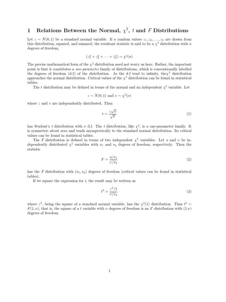 where z 2 , being the square of a standard normal variable, has the 2 (1) distribution. Thus t2 = F (1, ), that is, the square of a t variable with degrees of freedom is an F distribution with (1.) degrees of freedom.