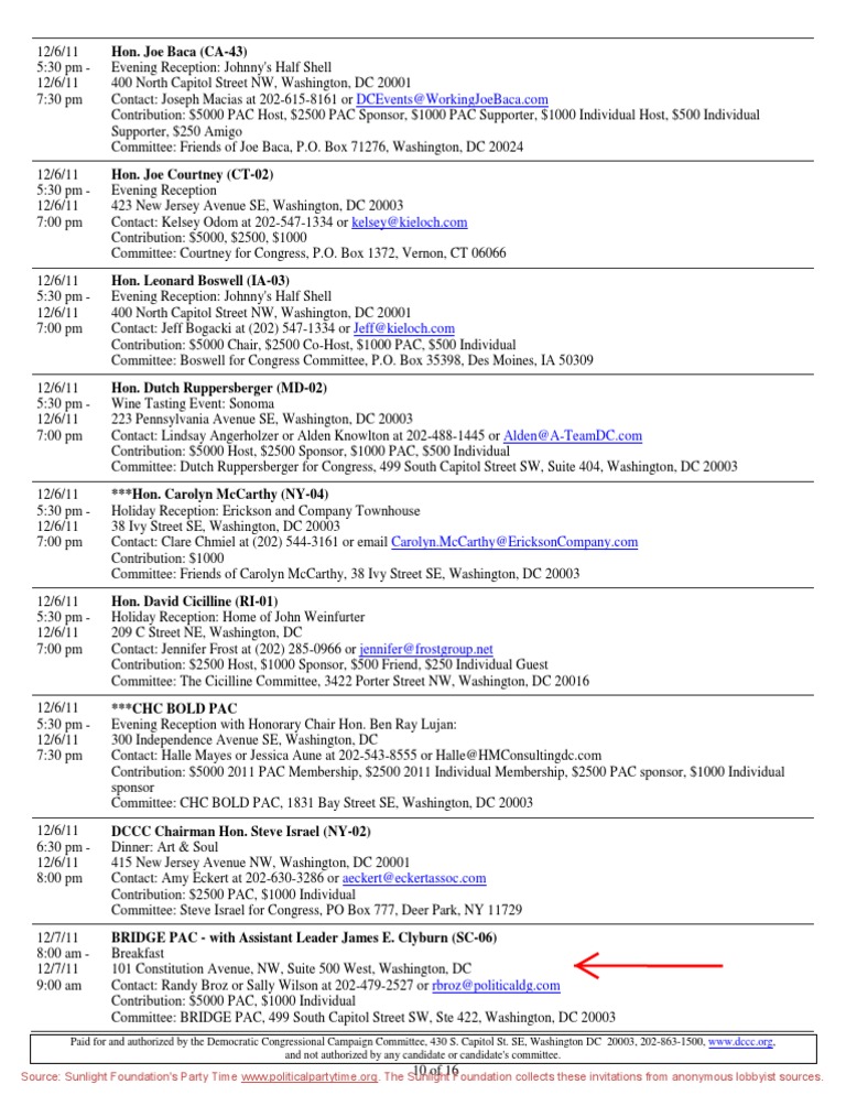Hon. Joe Baca (CA-43) Evening Reception: Johnny's Half Shell 400 North Capitol Street NW, Washington, DC 20001 Contact: Joseph Macias at 202-615-8161 or DCEvents@WorkingJoeBaca.com Contribution: $5000 PAC Host, $2500 PAC Sponsor, $1000 PAC Supporter, $1000 Individual Host, $500 Individual Supporter, $250 Amigo Committee: Friends of Joe Baca, P.O. Box 71276, Washington, DC 20024 Hon. Joe Courtney (CT-02) Evening Reception 423 New Jersey Avenue SE, Washington, DC 20003 Contact: Kelsey Odom at 202-547-1334 or kelsey@kieloch.com Contribution: $5000, $2500, $1000 Committee: Courtney for Congress, P.O. Box 1372, Vernon, CT 06066 Hon. Leonard Boswell (IA-03) Evening Reception: Johnny's Half Shell 400 North Capitol Street NW, Washington, DC 20001 Contact: Jeff Bogacki at (202) 547-1334 or Jeff@kieloch.com Contribution: $5000 Chair, $2500 Co-Host, $1000 PAC, $500 Individual Committee: Boswell for Congress Committee, P.O. Box 35398, Des Moines, IA 50309 Hon. Dutch Ruppersberger (MD-02) Wine Tasting Event: Sonoma 223 Pennsylvania Avenue SE, Washington, DC 20003 Contact: Lindsay Angerholzer or Alden Knowlton at 202-488-1445 or Alden@A-TeamDC.com Contribution: $5000 Host, $2500 Sponsor, $1000 PAC, $500 Individual Committee: Dutch Ruppersberger for Congress, 499 South Capitol Street SW, Suite 404, Washington, DC 20003 ***Hon. Carolyn McCarthy (NY-04) Holiday Reception: Erickson and Company Townhouse 38 Ivy Street SE, Washington, DC 20003 Contact: Clare Chmiel at (202) 544-3161 or email Carolyn.McCarthy@EricksonCompany.com Contribution: $1000 Committee: Friends of Carolyn McCarthy, 38 Ivy Street SE, Washington, DC 20003 Hon. David Cicilline (RI-01) Holiday Reception: Home of John Weinfurter 209 C Street NE, Washington, DC Contact: Jennifer Frost at (202) 285-0966 or jennifer@frostgroup.net Contribution: $2500 Host, $1000 Sponsor, $500 Friend, $250 Individual Guest Committee: The Cicilline Committee, 3422 Porter Street NW, Washington, DC 20016 ***CHC BOLD PAC Evening Reception with Honorary Chair Hon. Ben Ray Lujan: 300 Independence Avenue SE, Washington, DC Contact: Halle Mayes or Jessica Aune at 202-543-8555 or Halle@HMConsultingdc.com Contribution: $5000 2011 PAC Membership, $2500 2011 Individual Membership, $2500 PAC sponsor, $1000 Individual sponsor Committee: CHC BOLD PAC, 1831 Bay Street SE, Washington, DC 20003 DCCC Chairman Hon. Steve Israel (NY-02) Dinner: Art & Soul 415 New Jersey Avenue NW, Washington, DC 20001 Contact: Amy Eckert at 202-630-3286 or aeckert@eckertassoc.com Contribution: $2500 PAC, $1000 Individual Committee: Steve Israel for Congress, PO Box 777, Deer Park, NY 11729 BRIDGE PAC - with Assistant Leader James E. Clyburn (SC-06) Breakfast 101 Constitution Avenue, NW, Suite 500 West, Washington, DC Contact: Randy Broz or Sally Wilson at 202-479-2527 or rbroz@politicaldg.com Contribution: $5000 PAC, $1000 Individual Committee: BRIDGE PAC, 499 South Capitol Street SW, Ste 422, Washington, DC 20003