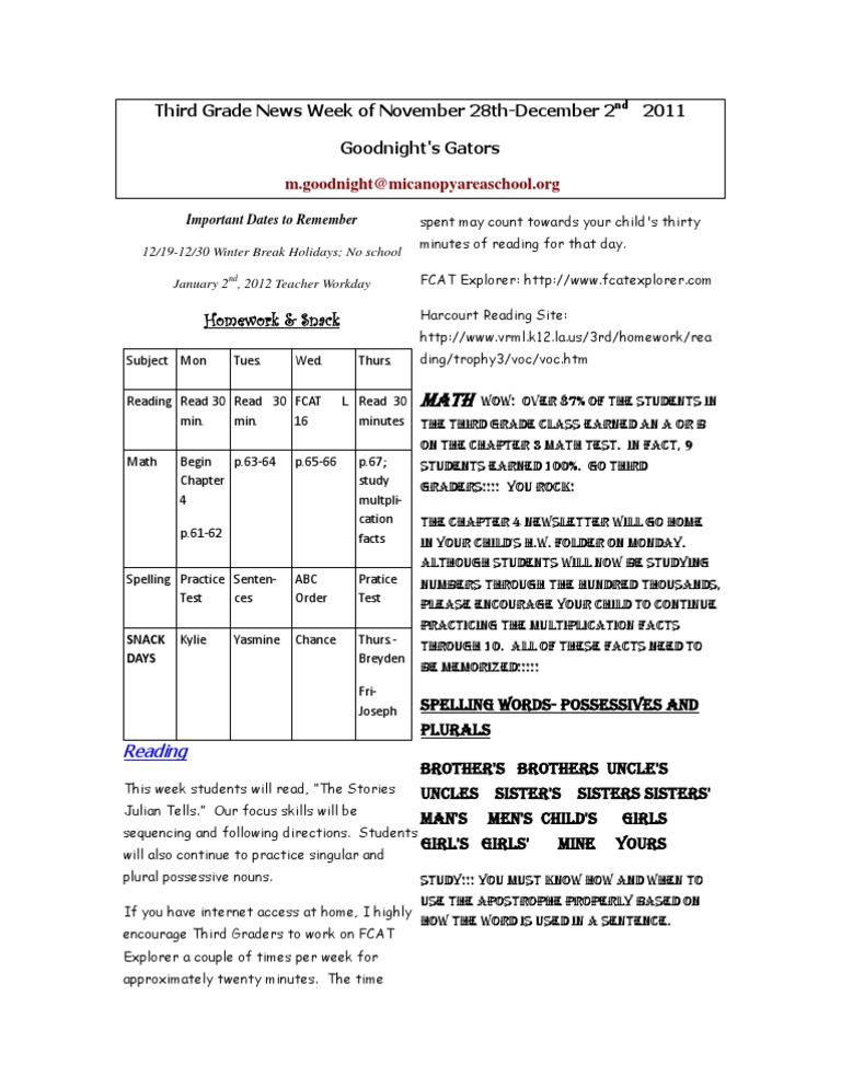 Third Grade News Week of November 28th-December 2nd 2011 Goodnight's Gators [Link]@micanopyareaschool.