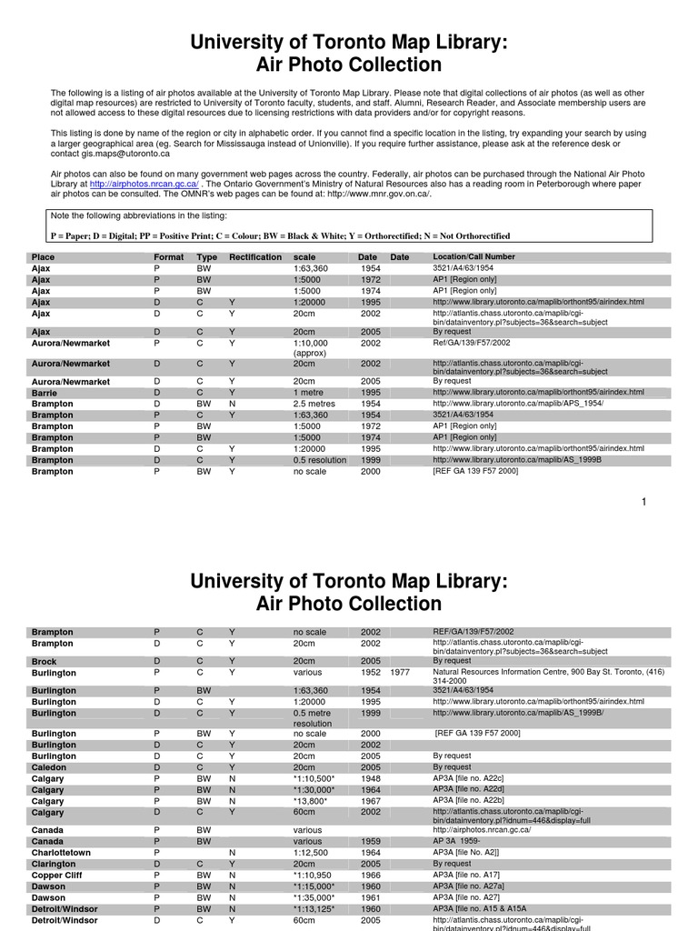 The following is a listing of air photos available at the University of Toronto Map Library. Please note that digital collections of air photos (as well as other digital map resources) are restricted to University of Toronto faculty, students, and staff. Alumni, Research Reader, and Associate membership users are not allowed access to these digital resources due to licensing restrictions with data providers and/or for copyright reasons. This listing is done by name of the region or city in alphabetic order. If you cannot find a specific location in the listing, try expanding your search by using a larger geographical area (eg. Search for Mississauga instead of Unionville). If you require further assistance, please ask at the reference desk or contact [Link]@[Link] Air photos can also be found on many government web pages across the country. Federally, air photos can be purchased through the National Air Photo Library at [Link] . The Ontario Governments Ministry of Natural Resources also has a reading room in Peterborough where paper air photos can be consulted. The OMNRs web pages can be found at: [Link] Note the following abbreviations in the listing: P = Paper; D = Digital; PP = Positive Print; C = Colour; BW = Black & White; Y = Orthorectified; N = Not Orthorectified Place Ajax Ajax Ajax Ajax Ajax Ajax Aurora/Newmarket Aurora/Newmarket Aurora/Newmarket Barrie Brampton Brampton Brampton Brampton Brampton Brampton Brampton Format P P P D D D P D D D D P P P D D P Type BW BW BW C C C C C C C BW C BW BW C C BW Rectification scale 1:63,360 1:5000 1:5000 1:20000 20cm 20cm 1:10,000 (approx) 20cm 20cm 1 metre 2.5 metres 1:63,360 1:5000 1:5000 1:20000 0.5 resolution no scale Date 1954 1972 1974 1995 2002 2005 2002 2002 2005 1995 1954 1954 1972 1974 1995 1999 2000 Date