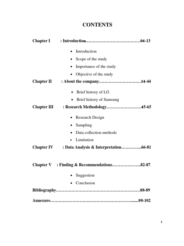 Chapter I : Introduction04-13 Introduction Scope of the study Importance of the study Objective of the study Chapter II : About the company14-44 Brief history of LG Brief history of Samsung Chapter III : Research Methodology.45-65 Research Design Sampling Data collection methods