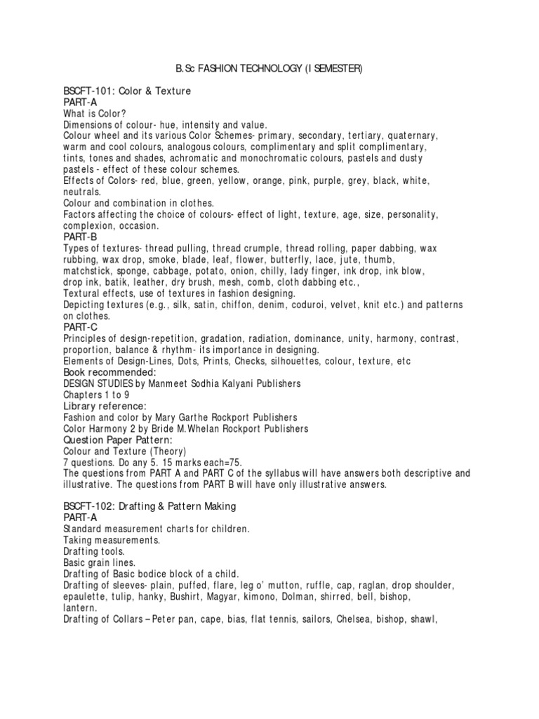 wing, shirt, rippled, Chinese, coat, cowl. PART-B Drafting of Kids casual wears- slip and panty, romper Drafting of frocks( A line, circular, frock with yoke, frock with empire, normal and low waist line) Drafting of skirts- gathered, novelty gathered, two tied, pleated( knife, box, inverted, sunray, kick), straight, a- line, pegged, tulip, circular, gored, handkerchief, hip rider, trumpet, slashed Drafting of Jumpsuit. PART-C Designing of all children garments- casual and formal wears (with specification sheets) Layouts- marker making (1/4 or 1/6 scale) for the designed garments Paper patterns of all kinds of garments for children(slip and panty, romper, frocks, skirts, jumpsuit, night suit, sundress) Book recommended: ADVANCED DRAFTING by Manmeet Sodhia Kalyani Publishers & DRAPING Chapters 1 to 8 Library reference: Basic Processes and clothing const. by Sherie Doongaji Rajj Prakashan Text book of clothing and textiles by Sushma Gupta Kalyani Publishers Pattern cutting made easy by Gillian Holman Batsford Garment const. skills by Premlata Malik Kalyani Publishers Question Paper Pattern: Drafting and Pattern Making (Theory 75 Marks) 2 questions (with internal choice). Q1. 35 Marks (do any 5 draftings out of 7 given, 7 marks each) - FROM PART A. Q2. 40Marks (2 paper pattern, do any 1) FROM PART B and PART C. BSCFT-103: Introduction to Textiles PART-A Flow chart from fiber to finished fabric Fiber classification Different methods of fiber identification- physical examination, burning test, chemical test. PART-B Properties of natural fibers (vegetable and animal) i.e. cotton, linen, wool, silk etc. Properties of Synthetic fibers i.e. Polyester, nylon, acrylic, etc. PART-C Different yarn formation process i.e. cotton yarn, woolen/ worsted yarn, synthetic or blended yarn- blending, opening, cleaning, carding, doubling, combing, drawing, roving, spinning, yarn twist-S and Z. Different types of yarns Fiber quality requirements for different types of yarns and fabrics. Industrial visits.