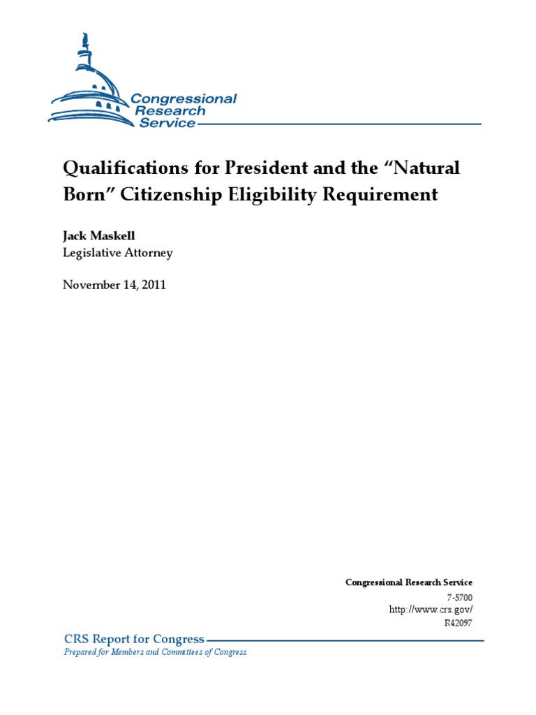 The Constitution sets out three eligibility requirements to be President: one must be 35 years of age, a resident within the United States for 14 years, and a natural born Citizen. There is no Supreme Court case which has ruled specifically on the presidential eligibility requirements (although several cases have addressed the term natural born citizen), and this clause has been the subject of several legal and historical treatises over the years, as well as more recent litigation. The term natural born citizen is not defined in the Constitution, and there is no discussion of the term evident in the notes of the Federal Convention of 1787. The use of the phrase in the Constitution may have derived from a suggestion in a letter from John Jay to George Washington during the Convention expressing concern about having the office of Commander-in-Chief devolve on, any but a natural born Citizen, as there were fears at that time about wealthy European aristocracy or royalty coming to America, gaining citizenship, and then buying and scheming their way to the presidency without long-standing loyalty to the nation. At the time of independence, and at the time of the framing of the Constitution, the term natural born with respect to citizenship was in use for many years in the American colonies, and then in the states, from British common law and legal usage. Under the common law principle of jus soli (law of the soil), persons born on English soil, even of two alien parents, were natural born subjects and, as noted by the Supreme Court, this same rule was applicable in the American colonies and in the United States afterwards, and continued to prevail under the Constitution ... with respect to citizens. In textual constitutional analysis, it is understood that terms used but not defined in the document must, as explained by the Supreme Court, be read in light of British common law since the Constitution is framed in the language of the English common law. In addition to historical and textual analysis, numerous holdings and references in federal (and state) cases for more than a century have clearly indicated that those born in the United States and subject to its jurisdiction (i.e., not born to foreign diplomats or occupying military forces), even to alien parents, are citizens at birth or by birth, and are natural born, as opposed to naturalized, U.S. citizens. There is no provision in the Constitution and no controlling American case law to support a contention that the citizenship of ones parents governs the eligibility of a native born U.S. citizen to be President. Although the eligibility of native born U.S. citizens has been settled law for more than a century, there have been legitimate legal issues raised concerning those born outside of the country to U.S. citizens. From historical material and case law, it appears that the common understanding of the term natural born in England and in the American colonies in the 1700s may have included both the strict common law meaning as born in the territory (jus soli), as well as the statutory laws adopted in England since at least 1350, which included children born abroad to British fathers (jus sanguinis, the law of descent). The weight of legal and historical authority indicates that the term natural born citizen would mean a person who is entitled to U.S. citizenship by birth or at birth, either by being born in the United States and under its jurisdiction, even those born to alien parents; by being born abroad to U.S. citizen-parents; or by being born in other situations meeting legal requirements for U.S. citizenship at birth. Such term, however, would not include a person who was not a U.S. citizen by birth or at birth, and who was thus born an alien required to go through the legal process of naturalization to become a U.S. citizen.