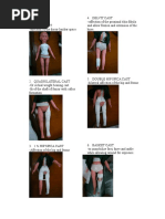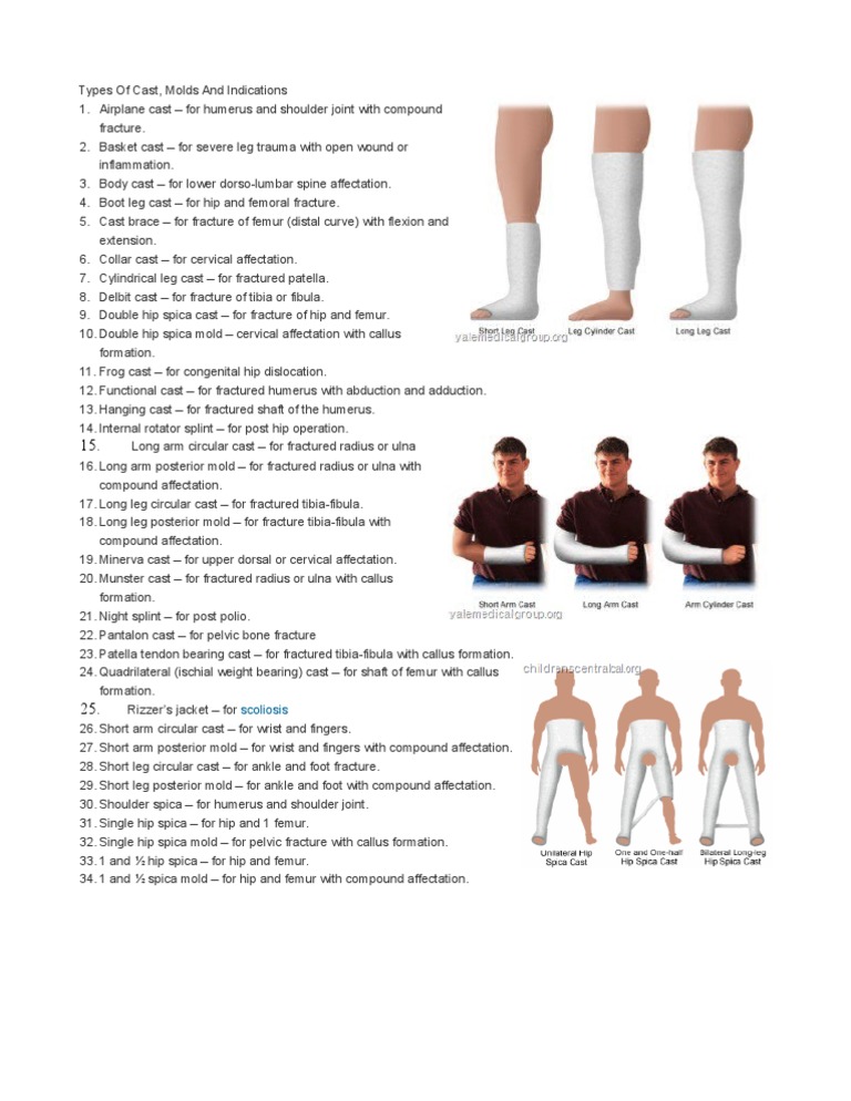 . 2. Basket cast for severe leg trauma with open wound or inflammation. 3. Body cast for lower dorso-lumbar spine affectation. 4. Boot leg cast for hip and femoral fracture. 5. Cast brace for fracture of femur (distal curve) with flexion and extension. 6. Collar cast for cervical affectation. 7. Cylindrical leg cast for fractured patella. 8. Delbit cast for fracture of tibia or fibula. 9. Double hip spica cast for fracture of hip and femur. 10. Double hip spica mold cervical affectation with callus formation. 11. Frog cast for congenital hip dislocation. 12. Functional cast for fractured humerus with abduction and adduction. 13. Hanging cast for fractured shaft of the humerus. 14. Internal rotator splint for post hip operation. 15. Long arm circular cast for fractured radius or ulna 16. Long arm posterior mold for fractured radius or ulna with compound affectation. 17. Long leg circular cast for fractured tibia-fibula. 18. Long leg posterior mold for fracture tibia-fibula with compound affectation. 19. Minerva cast for upper dorsal or cervical affectation. 20. Munster cast for fractured radius or ulna with callus formation. 21. Night splint for post polio. 22. Pantalon cast for pelvic bone fracture 23. Patella tendon bearing cast for fractured tibia-fibula with callus formation. 24. Quadrilateral (ischial weight bearing) cast for shaft of femur with callus formation. 25. Rizzers jacket for scoliosis 26. Short arm circular cast for wrist and fingers. 27. Short arm posterior mold for wrist and fingers with compound affectation. 28. Short leg circular cast for ankle and foot fracture. 29. Short leg posterior mold for ankle and foot with compound affectation. 30. Shoulder spica for humerus and shoulder joint. 31. Single hip spica for hip and 1 femur. 32. Single hip spica mold for pelvic fracture with callus formation. 33. 1 and hip spica for hip and femur. 34. 1 and spica mold for hip and femur with compound affectation.