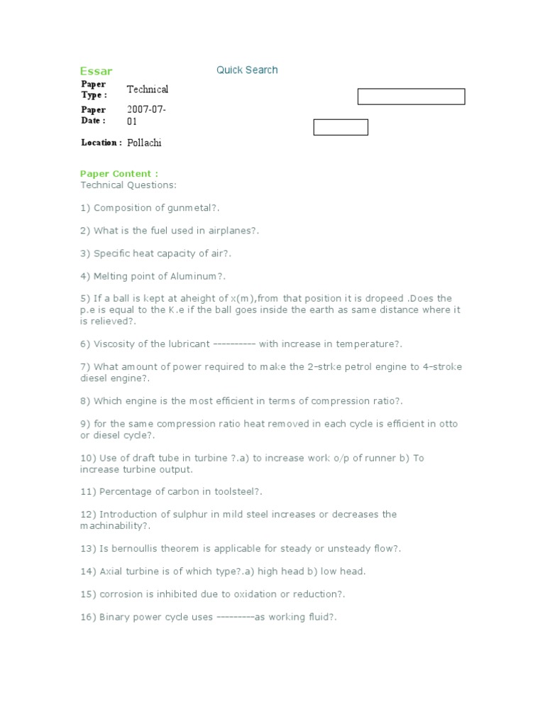 Technical Questions: 1) Composition of gunmetal?. 2) What is the fuel used in airplanes?. 3) Specific heat capacity of air?. 4) Melting point of Aluminum?. 5) If a ball is kept at aheight of x(m),from that position it is dropeed .Does the p.e is equal to the K.e if the ball goes inside the earth as same distance where it is relieved?. 6) Viscosity of the lubricant ---------- with increase in temperature?. 7) What amount of power required to make the 2-strke petrol engine to 4-stroke diesel engine?. 8) Which engine is the most efficient in terms of compression ratio?. 9) for the same compression ratio heat removed in each cycle is efficient in otto or diesel cycle?. 10) Use of draft tube in turbine ?.a) to increase work o/p of runner b) To increase turbine output. 11) Percentage of carbon in toolsteel?. 12) Introduction of sulphur in mild steel increases or decreases the machinability?. 13) Is bernoullis theorem is applicable for steady or unsteady flow?. 14) Axial turbine is of which type?.a) high head b) low head. 15) corrosion is inhibited due to oxidation or reduction?. 16) Binary power cycle uses ---------as working fluid?.
