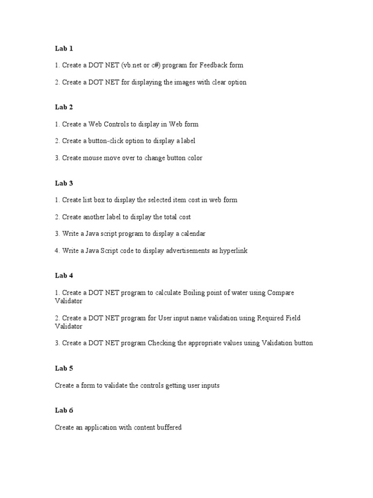 Create a DOT NET for displaying the images with clear option Lab 2 1. Create a Web Controls to display in Web form 2. Create a button-click option to display a label 3. Create mouse move over to change button color Lab 3 1. Create list box to display the selected item cost in web form 2. Create another label to display the total cost 3. Write a Java script program to display a calendar 4. Write a Java Script code to display advertisements as hyperlink Lab 4 1. Create a DOT NET program to calculate Boiling point of water using Compare Validator 2. Create a DOT NET program for User input name validation using Required Field Validator 3. Create a DOT NET program Checking the appropriate values using Validation button Lab 5 Create a form to validate the controls getting user inputs Lab 6 Create an application with content buffered