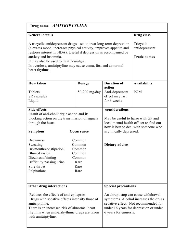 physical activity, improves appetite and restores interest in NDA). Useful if depression is accompanied by anxiety and insomnia. It may also be used to treat neuralgia. In overdose, amitriptyline may cause coma, fits, and abnormal heart rhythms. How taken Tablets SR capsules Liquid Dosage Duration of action 50-200 mg/day Anti-depressant effect may last for 6 weeks considerations May be useful to liaise with GP and local mental health officer to find out how is best to deal with someone who is clinically depressed. Dietary advice Drug class Tricyclic antidepressant Trade names