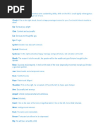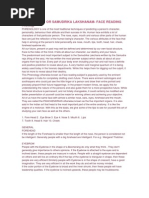 widowhood. Flat/short neck denotes a barren woman. Bent or curved forward denotes slavish tendency. Throat Straight and slightly raised in centre is lucky. Chin Pink, soft, fleshy chin is a sign of luck. Double or hairy chin is unlucky. Cheeks Raised, fleshy, round and pink in colour denotes luck. Hard or deep without flesh are evil signs. Mouth Round, smooth and with good odour are lucky signs. Lips (Lower) Red like a lotus petal, smooth and divided in the middle is very auspicious. Dark, long, dry lips indicate widowhood and misery. Lips (Upper) Red, slightly raised in the middle, smooth without hair, is very auspicious. Teeth Pearl white, even, 32, are lucky. If the number of teeth in lower jaw are more than in the upper jaw or yellowish, long or double, spread out, are indications of bad luck. Tongue Red and soft tongue shows enjoyment. Caved in, in the middle and spread out in front indicates misery. White tongue indicates death in water. Dark tongue denotes quarrelsome nature. Thick tongue denotes poverty. Long tongue - one who is omnivorous; long and broad denotes lunacy. Upper portion inside mouth Red, soft, smooth indicates luck White .............................. widowhood Yellow ............................. recluse Black ............................. barren Dry ................................. large family Laughter When she laughs, if her cheeks are raised and teeth are not visible, it is a sign of luck.
