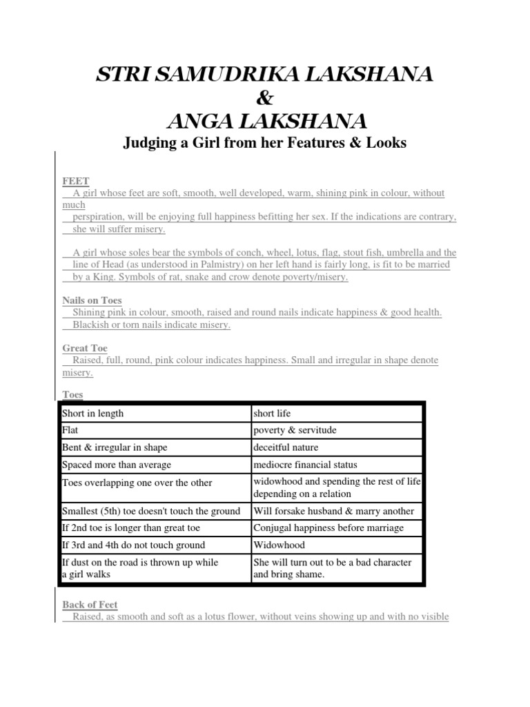 FEET A girl whose feet are soft, smooth, well developed, warm, shining pink in colour, without much perspiration, will be enjoying full happiness befitting her sex. If the indications are contrary, she will suffer misery. A girl whose soles bear the symbols of conch, wheel, lotus, flag, stout fish, umbrella and the line of Head (as understood in Palmistry) on her left hand is fairly long, is fit to be married by a King. Symbols of rat, snake and crow denote poverty/misery. Nails on Toes Shining pink in colour, smooth, raised and round nails indicate happiness & good health. Blackish or torn nails indicate misery. Great Toe Raised, full, round, pink colour indicates happiness. Small and irregular in shape denote misery. Toes Short in length Flat Bent & irregular in shape Spaced more than average Toes overlapping one over the other Smallest (5th) toe doesn't touch the ground If 2nd toe is longer than great toe If 3rd and 4th do not touch ground If dust on the road is thrown up while a girl walks short life poverty & servitude deceitful nature mediocre financial status widowhood and spending the rest of life depending on a relation Will forsake husband & marry another Conjugal happiness before marriage Widowhood She will turn out to be a bad character and bring shame.