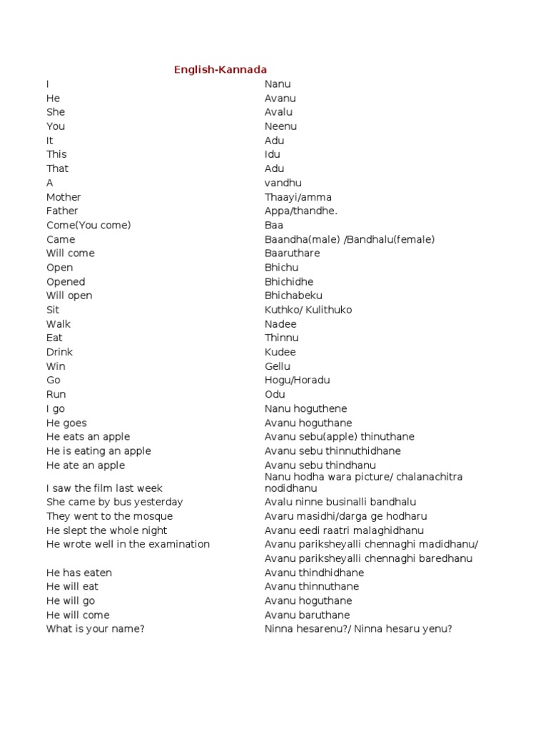 Father Appa/thandhe. Come(You come) Baa Came Baandha(male) /Bandhalu(female) Will come Baaruthare Open Bhichu Opened Bhichidhe Will open Bhichabeku Sit Kuthko/ Kulithuko Walk Nadee Eat Thinnu Drink Kudee Win Gellu Go Hogu/Horadu Run Odu I go Nanu hoguthene He goes Avanu hoguthane He eats an apple Avanu sebu(apple) thinuthane He is eating an apple Avanu sebu thinnuthidhane He ate an apple Avanu sebu thindhanu Nanu hodha wara picture/ chalanachitra I saw the film last week nodidhanu She came by bus yesterday Avalu ninne businalli bandhalu They went to the mosque Avaru masidhi/darga ge hodharu He slept the whole night Avanu eedi raatri malaghidhanu He wrote well in the examination Avanu pariksheyalli chennaghi madidhanu/ Avanu pariksheyalli chennaghi baredhanu He has eaten Avanu thindhidhane He will eat Avanu thinnuthane He will go Avanu hoguthane He will come Avanu baruthane What is your name? Ninna hesarenu?/ Ninna hesaru yenu?