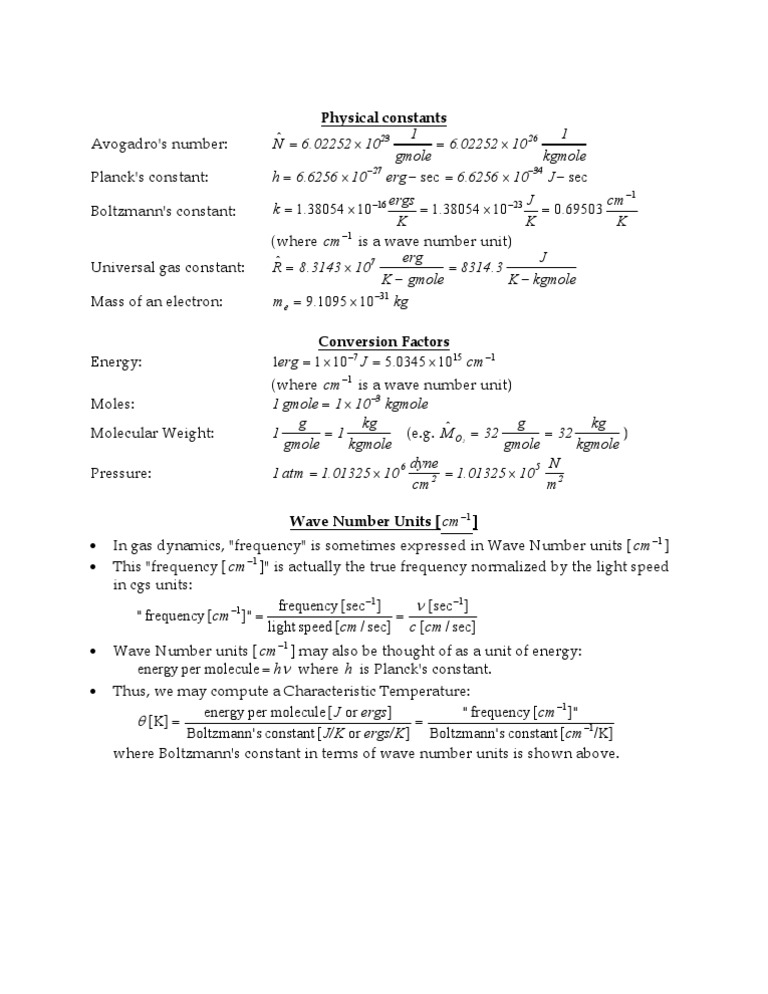 In gas dynamics, "frequency" is sometimes expressed in Wave Number units [ cm 1 ] This "frequency [ cm 1 ]" is actually the true frequency normalized by the light speed in cgs units: [sec 1 ] frequency [sec 1 ] " frequency [cm 1 ]" = = light speed [cm / sec] c [cm / sec] Wave Number units [ cm 1 ] may also be thought of as a unit of energy: energy per molecule = h where h is Planck's constant. Thus, we may compute a Characteristic Temperature: energy per molecule [ J or ergs ] " frequency [cm 1 ]" [K] = = Boltzmann' s constant [ J/K or ergs/K ] Boltzmann' s constant [cm 1 /K] where Boltzmann's constant in terms of wave number units is shown above.