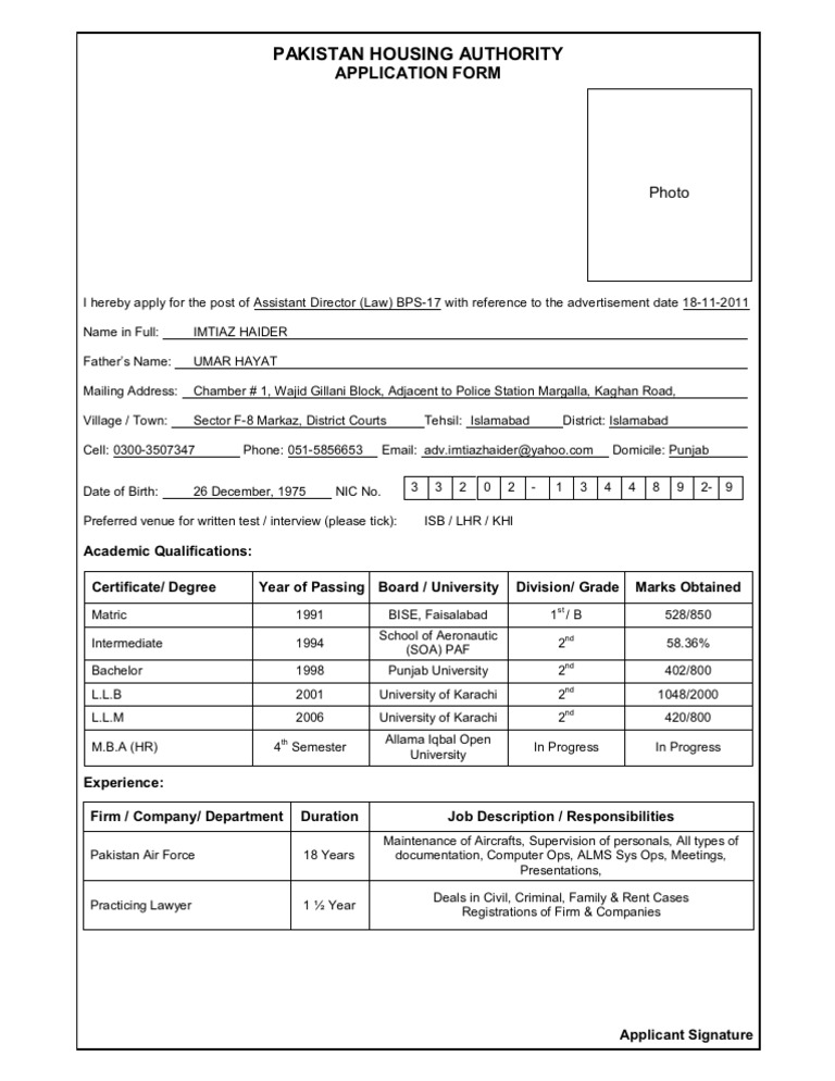 I hereby apply for the post of Assistant Director (Law) BPS-17 with reference to the advertisement date 18-11-2011 Name in Full: Fathers Name: Mailing Address: Village / Town: IMTIAZ HAIDER UMAR HAYAT Chamber # 1, Wajid Gillani Block, Adjacent to Police Station Margalla, Kaghan Road, Sector F-8 Markaz, District Courts Phone: 051-5856653 NIC No. Tehsil: Islamabad District: Islamabad Domicile: Punjab 4 4 8 9 29