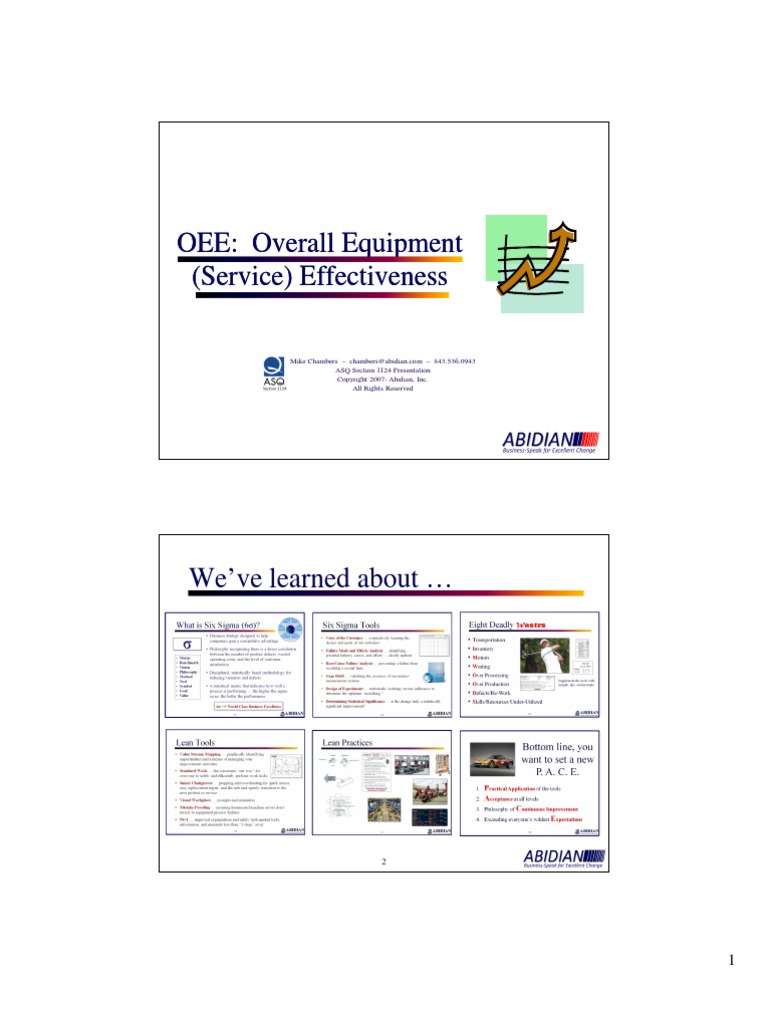 Companies make money by adding value to materials and services to make products customers want As most companies use machines, people, and production lines to add value to their products, its important they perform efficiently Overall Equipment/Service Effectiveness (OEE) is a metric used in Lean and Six Sigma to indicate how efficiently business systems are performing OEE promotes openness in information sharing and a no-blame approach in handling system-related issues.