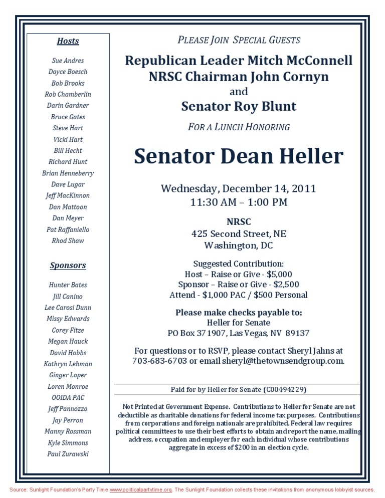 Suggested Contribution: Host Raise or Give - $5,000 Sponsor Raise or Give - $2,500 Attend - $1,000 PAC / $500 Personal Please make checks payable to: Heller for Senate PO Box 371907, Las Vegas, NV 89137 For questions or to RSVP, please contact Sheryl Jahns at 703-683-6703 or email sheryl@thetownsendgroup.com.