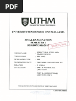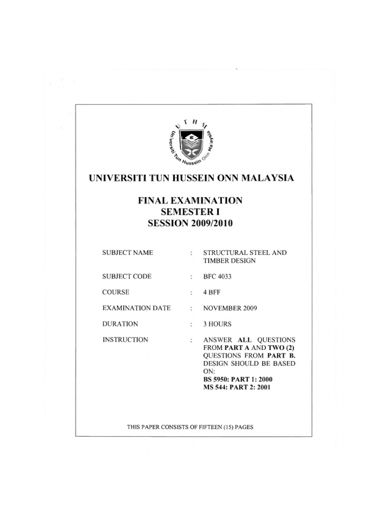 FINAL EXAMINATION SEMESTER/ SESSION SUBJECT : SEMESTER 1 2009/2010 : STRUCTURAL STEEL AND TIMBER DESIGNS COURSE SUBJECT CODE 4 BFF BFC 4033