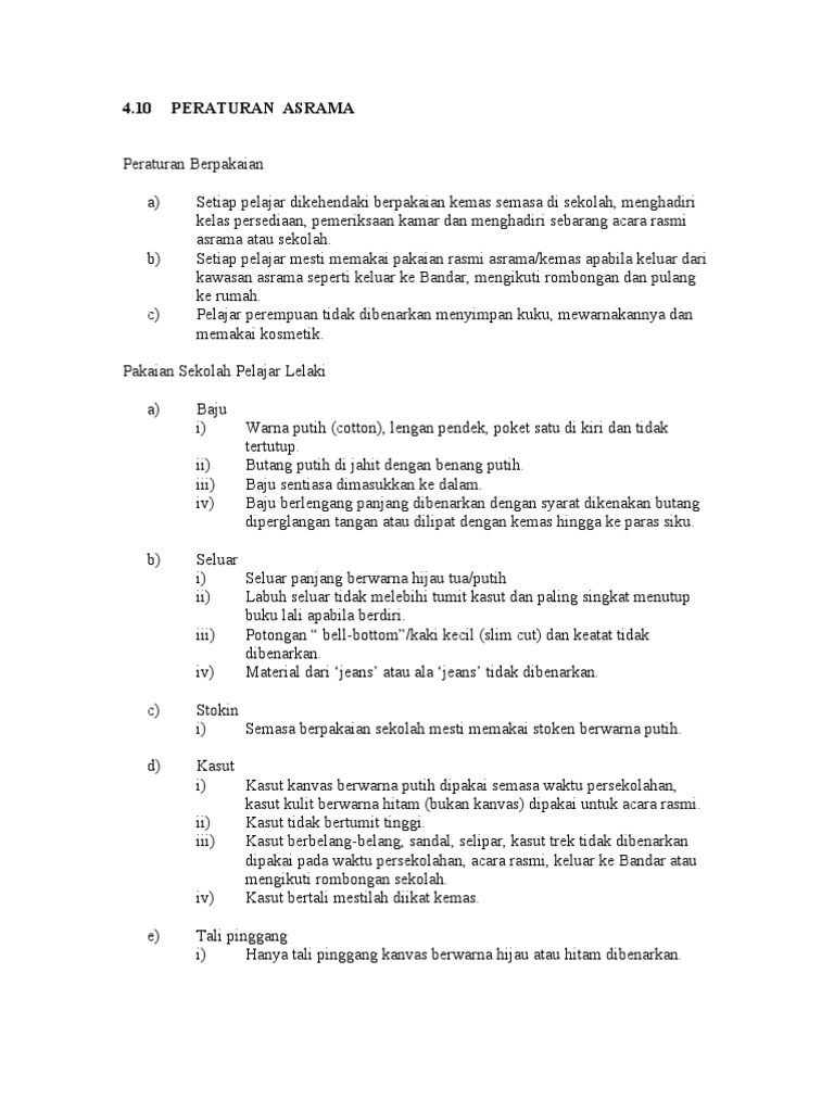 Peraturan Berpakaian a) b) c) Setiap pelajar dikehendaki berpakaian kemas semasa di sekolah, menghadiri kelas persediaan, pemeriksaan kamar dan menghadiri sebarang acara rasmi asrama atau sekolah. Setiap pelajar mesti memakai pakaian rasmi asrama/kemas apabila keluar dari kawasan asrama seperti keluar ke Bandar, mengikuti rombongan dan pulang ke rumah. Pelajar perempuan tidak dibenarkan menyimpan kuku, mewarnakannya dan memakai kosmetik.