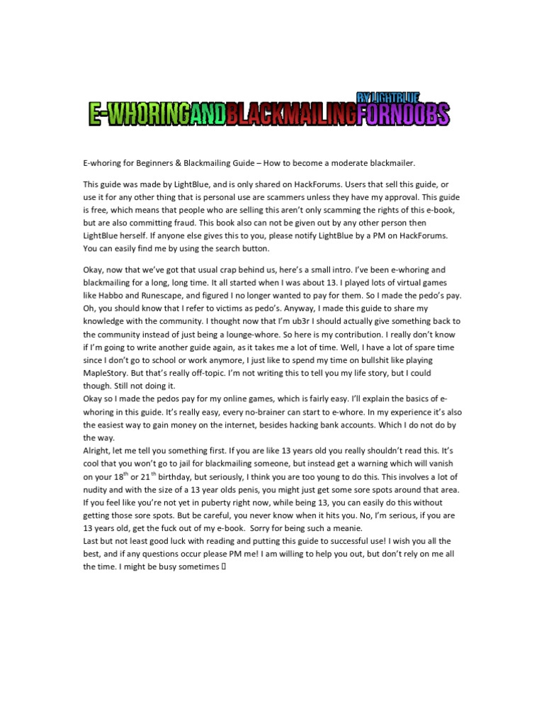LightBlue has been e-whoring and blackmailing for a long, long time. This guide was made to share my knowledge with the community. If anyone else gives this to you, please notify LightBlue by a PM on HackForums.