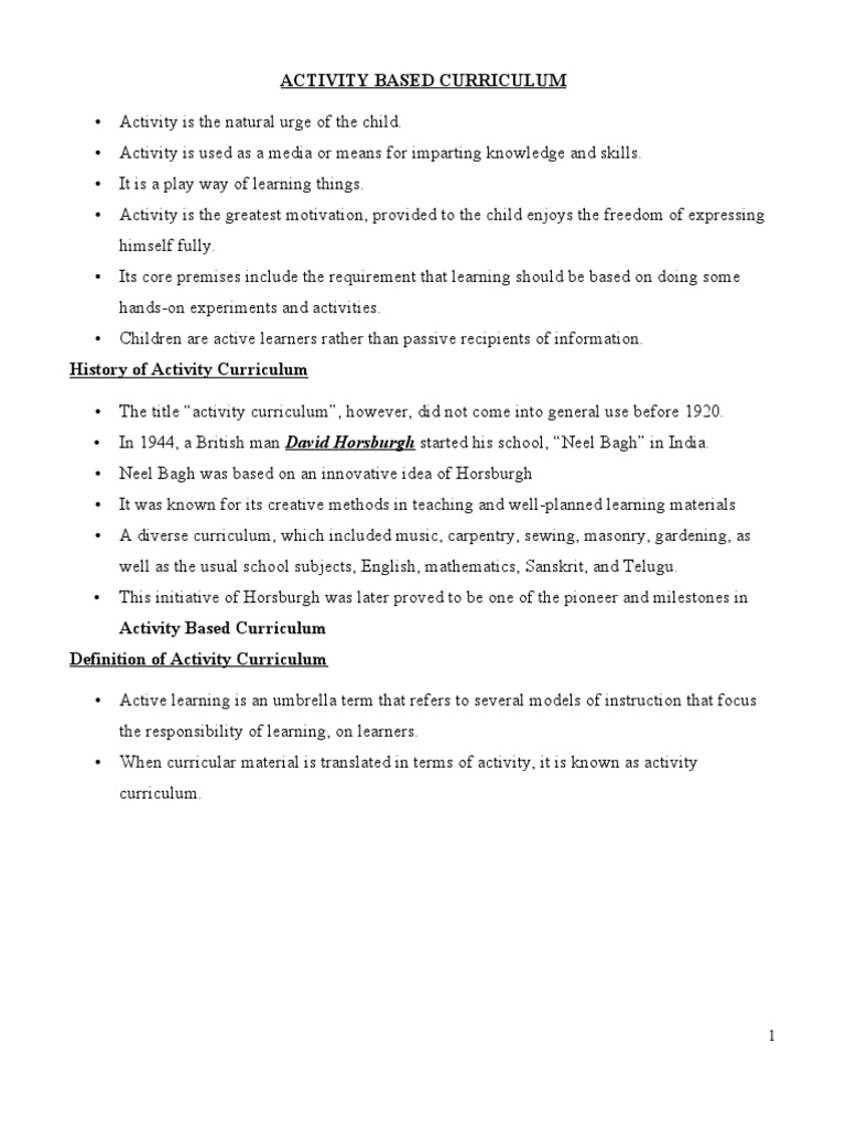 The title activity curriculum, however, did not come into general use before 1920. In 1944, a British man David Horsburgh started his school, Neel Bagh in India. Neel Bagh was based on an innovative idea of Horsburgh It was known for its creative methods in teaching and well-planned learning materials A diverse curriculum, which included music, carpentry, sewing, masonry, gardening, as well as the usual school subjects, English, mathematics, Sanskrit, and Telugu. This initiative of Horsburgh was later proved to be one of the pioneer and milestones in Activity Based Curriculum