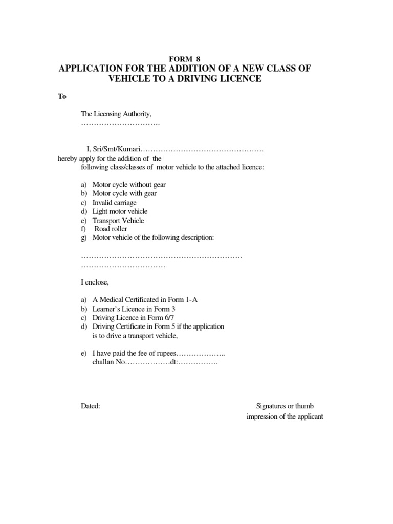 I, Sri/Smt/Kumari. hereby apply for the addition of the following class/classes of motor vehicle to the attached licence: a) b) c) d) e) f) g) Motor cycle without gear Motor cycle with gear Invalid carriage Light motor vehicle Transport Vehicle Road roller Motor vehicle of the following description: