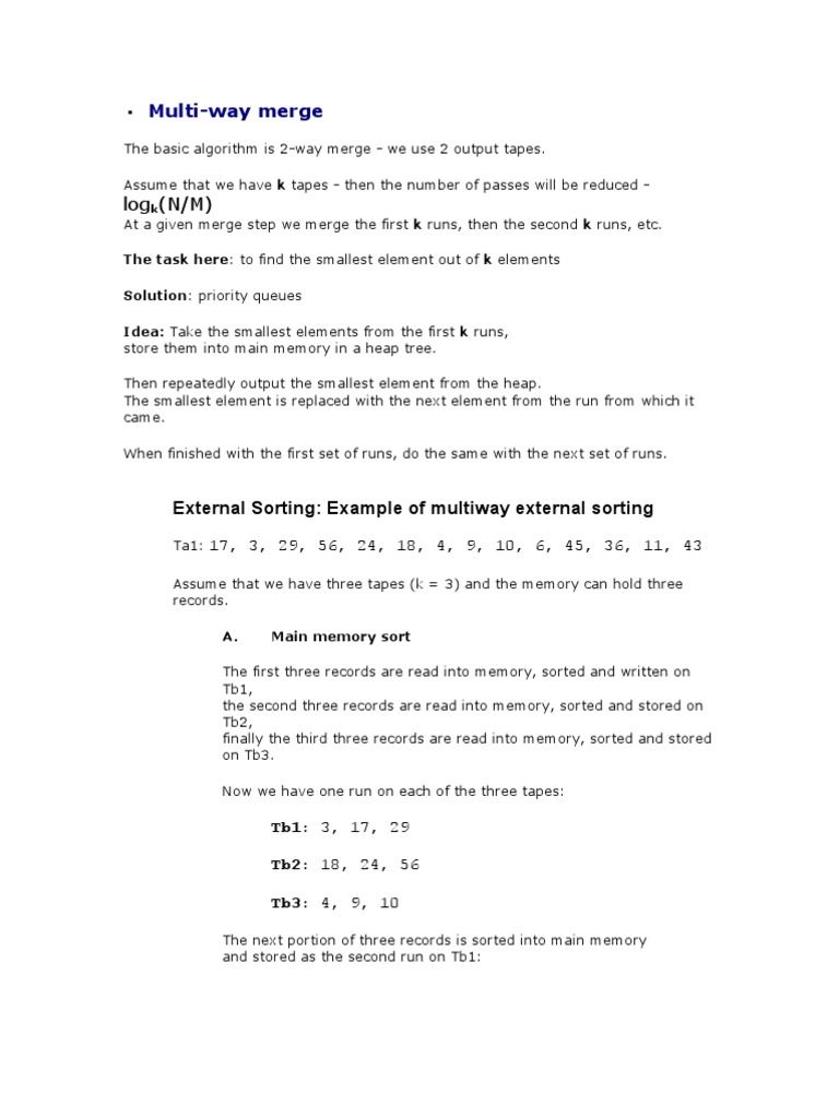 This finishes the first pass. B.2. Building runs of length k*k*M We have now only two tapes: Ta1 and Ta2. o We build a heap of the first elements of the two tapes 3 and 6, and output the smallest element '3' to tape Tb1. o Then we read the next record from the tape where the record '3' belonged - Ta1, and insert it into the heap. o Now the heap contains 6 and 4, and using the deleteMin operation the smallest record - 4 is output to tape Tb1. Proceeding in this way, the entire file will be sorted on tape Tb1.