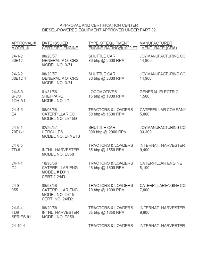 APPROVAL # MODEL # 24-1-2 60E12 24-2-2 60E12-1 24-3-3 B-3/3 1DH-A1 24-4-3 D4 24-5-1 70E1-1 24-6-5 TD-9 24-7-1 D2 DATE ISSUED CERTIFIED ENGINE 08/28/57 GENERAL MOTORS MODEL NO. 3-71 08/28/57 GENERAL MOTORS MODEL NO. 3-71 01/31/56 SHEPPARD MODEL NO. 17 08/06/56 CATERPILLAR CO. MODEL NO. D315G 02/25/57 HERCULES MODEL NO. DFXETS INTNL. HARVESTER MODEL NO. D350 10/30/56 CATERPILLAR ENG. MODEL # D311 CERT.# 24/D1 08/03/56 CATERPILLAR ENG. MODEL NO. D315 CERT. NO. 24/D2 08/29/58 INTNL. HARVESTER MODEL NO. D350 TYPE OF EQUIPMENT MANUFACTURER ENGINE RATING@1000 FT VENT. RATE (CFM) SHUTTLE CAR 80 bhp @ 2000 RPM SHUTTLE CAR 80 bhp @ 2000 RPM LOCOMOTIVES 15 bhp @ 1800 RPM TRACTORS & LOADERS 50 bhp @ 1600 RPM SHUTTLE CAR 300 bhp @ 2000 RPM TRACTORS & LOADERS 65 bhp @ 1550 RPM TRACTORS & LOADERS 46 bhp @ 1800 RPM JOY MANUFACTURING CO. 14,900 JOY MANUFACTURING CO. 14,900 GENERAL ELECTRIC 1,500 CATERPILLAR COMPANY 5,000 JOY MANUFACTURING CO. 33,300 INTERNAT. HARVESTER 9,400 CATERPILLAR ENGINE 5,100
