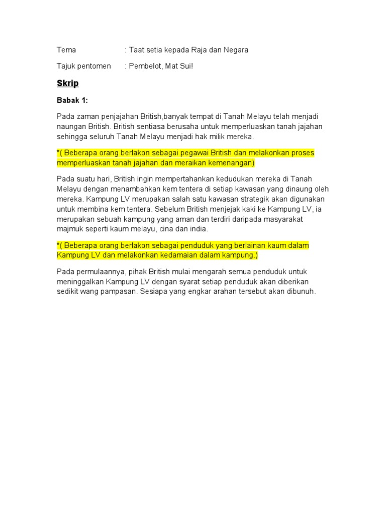 Babak 2: Pak Mat merupakan penghulu kampung yang mmiliki tanah yang terbesar dalam kampung tersebut. British telah menghantar beberapa orang untuk berunding dengan Pak Mat agar beliau sudi menjual tanah pustaka beliau kepada mereka di samping menghasut semua penduduk untuk meninggalkan kampung tersebut. *Seorang pegawai British berbisik di tepi telinga orang tengah (penterjemah). *Seorang budak sedang mencuri dengar perbualan tersebut di tepi pintu. Orang tengah: Pak Mat, saya menasihati pak agar menjualkan tanah pustaka pak. Kami akan menggunakan 10 Juta Pound untuk membelikan semua tanah pustaka pak. Selain itu, pak juga akan menerima komisen daripada British sekiranya pak berjaya menasihati semua penduduk kampung untuk meninggalkan kampung ini. Pak Mat: Apa? Maksudnya kamu ingin saya menjadi pembelot bagi Kampung LV dan Negara? Tak mungkin! Tak mungkin!