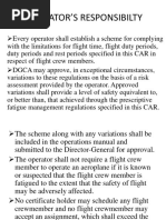 time. For flight duty periods beyond 3 or more time zones, the window of circadian low is estimated to be 0200 to 0600 home-base/ domicile time for the first 48 hours only. After a crew member remains more than 48 hours away from home-base/ domicile time, the window of circadian low is estimated to be 0200 to 0600 referred to local time at the point of departure. 4. 4.1 OPERATORS RESPONSIBILITY Every operator shall establish a scheme for complying with the limitations for flight time, flight duty periods, duty periods and rest periods specified in this CAR in respect of flight crew members. DGCA may approve, in exceptional circumstances, variations to these regulations on the basis of a risk assessment provided by the operator. Approved variations shall provide a level of safety equivalent to, or better than, that achieved through the prescriptive fatigue management regulations specified in this CAR. The scheme along with any variations shall be included in the operations manual and submitted to the Director-General for approval. The operator shall not require a flight crew member to operate an aeroplane if it is known or suspected that the flight crew member is fatigued to the extent that the safety of flight may be adversely affected. No certificate holder may schedule any flight crewmember and no flight crewmember may accept an assignment, which shall exceed the prescribed limitations. Operators shall ensure that persons concerned with the operations of aircraft are trained and educated regarding dangers of fatigue, the causes of sleepiness and importance of sleep and proper sleep habits. FLIGHT CREW MEMBERS RESPONSIBILITY A flight crew member shall not operate an aeroplane when he or she knows that he or she is fatigued or feels unfit to the extent that the safety of flight may be adversely affected. Flight crew members shall make best use of facilities and opportunities that are provided for rest and for the consumption of meals, and shall plan and use rest periods to ensure that they are fully rested.