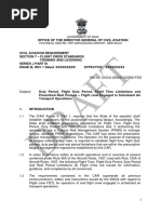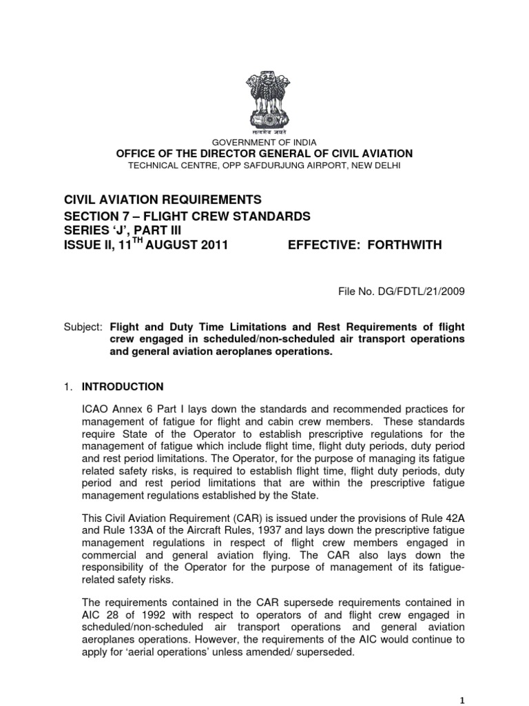File No. DG/FDTL/21/2009 Subject: Flight and Duty Time Limitations and Rest Requirements of flight crew engaged in scheduled/non-scheduled air transport operations and general aviation aeroplanes operations. 1. INTRODUCTION ICAO Annex 6 Part I lays down the standards and recommended practices for management of fatigue for flight and cabin crew members. These standards require State of the Operator to establish prescriptive regulations for the management of fatigue which include flight time, flight duty periods, duty period and rest period limitations. The Operator, for the purpose of managing its fatigue related safety risks, is required to establish flight time, flight duty periods, duty period and rest period limitations that are within the prescriptive fatigue management regulations established by the State. This Civil Aviation Requirement (CAR) is issued under the provisions of Rule 42A and Rule 133A of the Aircraft Rules, 1937 and lays down the prescriptive fatigue management regulations in respect of flight crew members engaged in commercial and general aviation flying. The CAR also lays down the responsibility of the Operator for the purpose of management of its fatiguerelated safety risks. The requirements contained in the CAR supersede requirements contained in AIC 28 of 1992 with respect to operators of and flight crew engaged in scheduled/non-scheduled air transport operations and general aviation aeroplanes operations. However, the requirements of the AIC would continue to apply for aerial operations unless amended/ superseded.