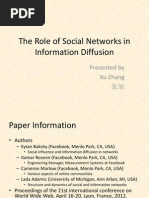 nd that the majority of inuence results from exposure to individual weak ties, which indicates that most information diusion on Facebook is driven by simple contagion. This stands in contrast to prior studies of inuence on the adoption of products, behaviors or opinions, which center around the eect of having multiple or densely connected contacts who have adopted [6, 7, 14, 13]. Our results suggest that in large online environments, the low cost of disseminating information fosters diusion dynamics that are dierent from situations where adoption is subject to positive externalities or carries a high cost. Because we are unable to observe interactions that occur outside of Facebook, a limitation of our study is that we can only fully identify causal eects within the site. Correlated sharing in the no feed condition may occur because friends independently visit and share the same page as one another, or because one user is inuenced to share via an external communication channel. Although we are not able to directly evaluate the relative contribution of these two potential causes, our results allow us to obtain a bound on the eect on sharing behavior within the site. The probability of sharing in the no feed condition, which is a combination of similarity and external inuence, is an upper bound on how much sharing occurs because of homophily-related eects. Likewise, the dierence in the probability of sharing within the feed and no feed condition gives a lower bound on how much on-site sharing is due to interpersonal inuence along any communication medium. The mass adoption of online social networking systems has the potential to dramatically alter an individuals exposure to new information. By applying an experimental approach to measuring diusion outcomes within one of the largest human communication networks, we are able to rigorously quantify the eect of social networks on information spread. The present work sheds light on aggregate trends over a large population; future studies may investigate how properties of the individual, such as age, gender, and nationality, or features of content, such as popularity and breadth of appeal, relate to the inuence and its confounds.
