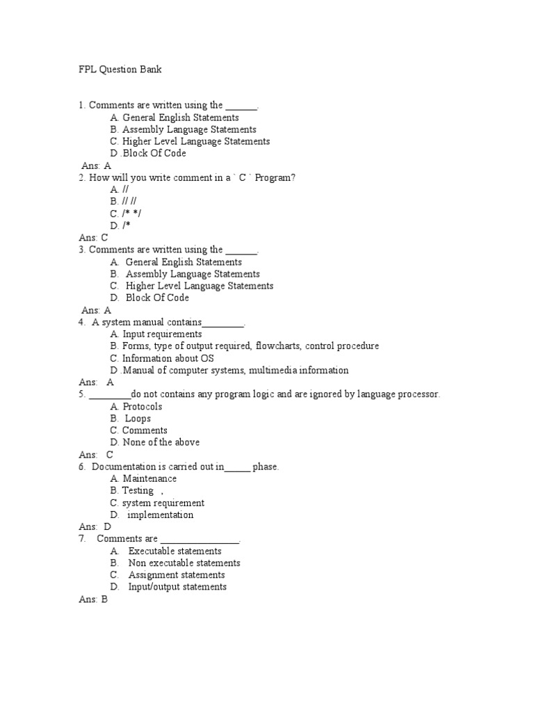 Assembly Language Statements C. Higher Level Language Statements D .Block Of Code Ans: A 2. How will you write comment in a ` C ` Program? A. // B. // // C. /* */ D. /* Ans: C 3. Comments are written using the ______. A. General English Statements B. Assembly Language Statements C. Higher Level Language Statements D. Block Of Code Ans: A 4. A system manual contains________. A. Input requirements B. Forms, type of output required, flowcharts, control procedure C. Information about OS D .Manual of computer systems, multimedia information Ans: A 5. ________do not contains any program logic and are ignored by language processor. A. Protocols B. Loops C. Comments D. None of the above Ans: C 6. Documentation is carried out in_____ phase. A. Maintenance B. Testing , C. system requirement D. implementation Ans: D 7. Comments are _______________. A. Executable statements B. Non executable statements C. Assignment statements D. Input/output statements Ans: B