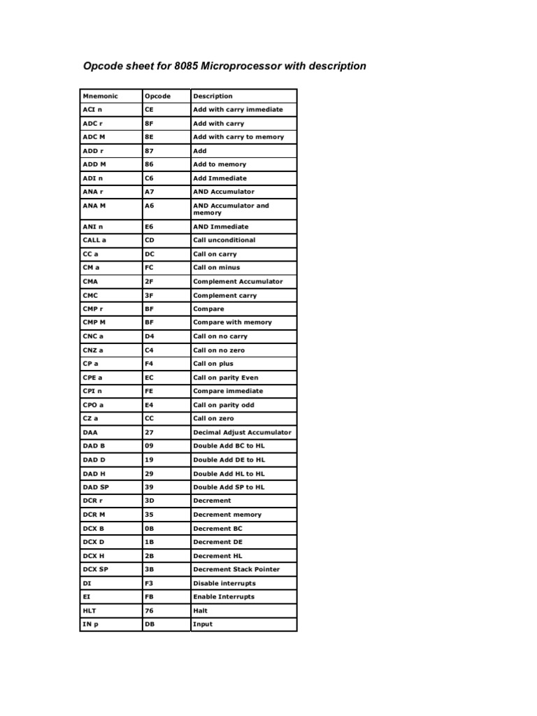 Tags: Opcode sheet for 8085 Microprocessor with description ,opcode sheet for 8085,opcode list for 8085,comments,explanation,free download ,pdf,8085 Microprocessor Assembly language opcodes