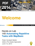 One of the reasons to work with data in a GIS is to have access to spatial properties that you would not have access to by simply looking at tabular data. One of the simple things that can be done with polygon data is to calculate the area of a feature. MapWindow provides a library of predefined spatial operations that can be accessed from a plug-in or a stand alone application. A. Add a button to the My First Plug-in menu called mfpArea and label it Calculate Area B. Add an ElseIf statement to handle clicks of the mfpArea button Since our sample data is in decimal degrees, any area calculation performed on the data set would yield meaningless results since the length of decimal degrees vary with latitude. To generate meaningful results, the data must be re-projected into an area conserving projection. C. Add the following lines of code to the ElseIF statement The following code retrieves the shapefile that we added to the map earlier. Dim myWorldShape As New [Link] myWorldShape = g_MapWin.Layers(0).GetObject() A temporary variable called myProjection is used to hold a string defining an equal area projection. Dim myProjection As String myProjection = "+proj=cea +lon_0=0 +lat_ts=0 +x_0=0 +y_0=0_ +ellps=WGS84 +datum=WGS84 +units=m +no_defs" The variable tmpShapePath is used to store the path to a temporary shapefile we will use to store the reprojected data set. Dim tmpShapePath As String tmpShapePath = [Link](".shp","[Link]") MapWinGeoPro is the MapWindow GIS processing library. In this case the [Link] is being used to reproject the myWorldShape shapefile and create a new temporary file. [Link](myWorldShape.P rojection, myProjection, [Link], tmpShapePath)
