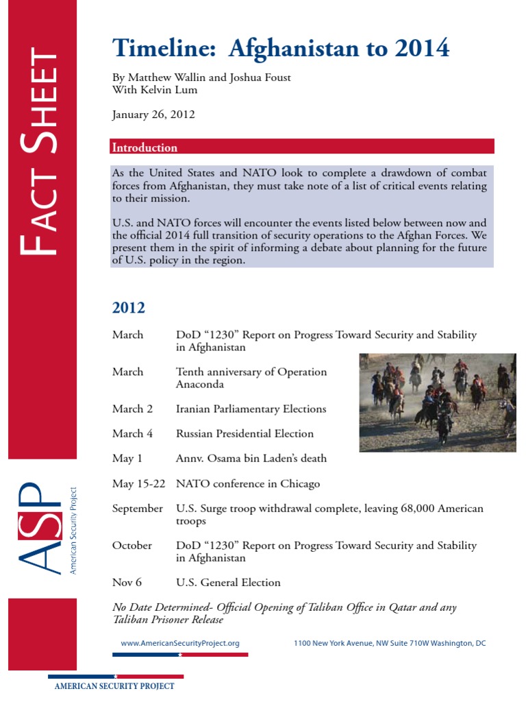March DoD “1230” Report on Progress Toward Security and Stability in AfghanistanMarch Tenth anniversary of Operation AnacondaMarch 2 Iranian Parliamentary ElectionsMarch 4 Russian Presidential ElectionMay 1 Annv. Osama bin Laden’s deathMay 15-22 NATO conference in ChicagoSeptember U.S. Surge troop withdrawal complete, leaving 68,000 AmericantroopsOctober DoD “1230” Report on Progress Toward Security and Stability in AfghanistanNov 6 U.S. General Election