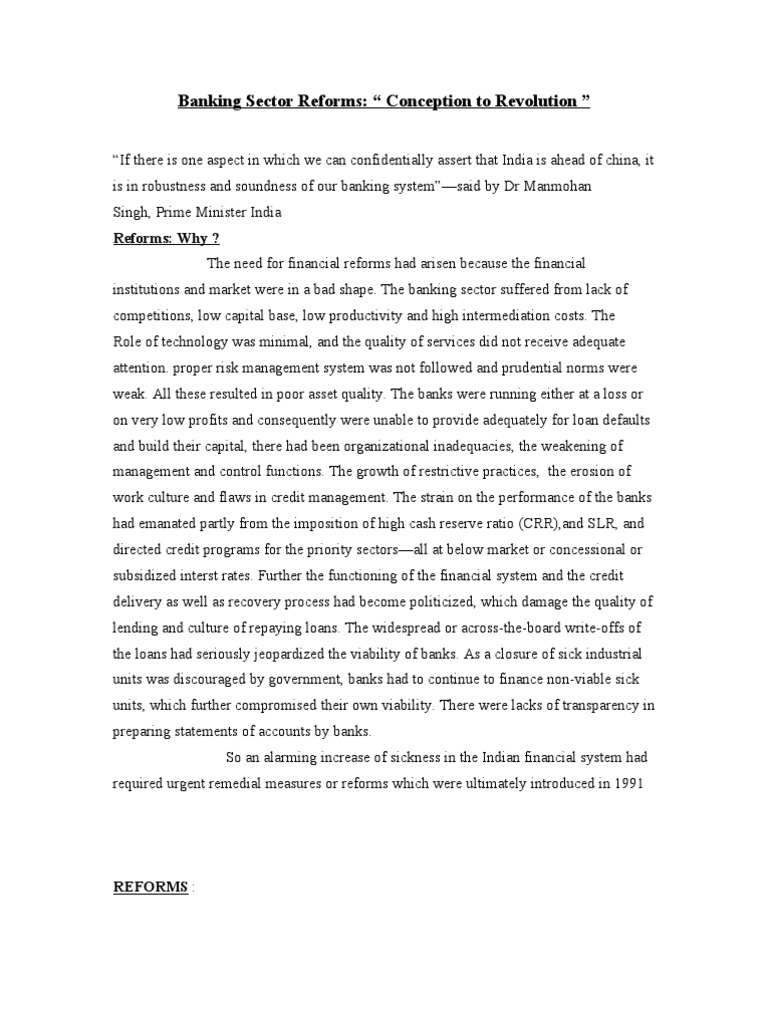 If there is one aspect in which we can confidentially assert that India is ahead of china, it is in robustness and soundness of our banking systemsaid by Dr Manmohan Singh, Prime Minister India Reforms: Why ? The need for financial reforms had arisen because the financial institutions and market were in a bad shape. The banking sector suffered from lack of competitions, low capital base, low productivity and high intermediation costs. The Role of technology was minimal, and the quality of services did not receive adequate attention. proper risk management system was not followed and prudential norms were weak. All these resulted in poor asset quality. The banks were running either at a loss or on very low profits and consequently were unable to provide adequately for loan defaults and build their capital, there had been organizational inadequacies, the weakening of management and control functions. The growth of restrictive practices, the erosion of work culture and flaws in credit management. The strain on the performance of the banks had emanated partly from the imposition of high cash reserve ratio (CRR),and SLR, and directed credit programs for the priority sectorsall at below market or concessional or subsidized interst rates. Further the functioning of the financial system and the credit delivery as well as recovery process had become politicized, which damage the quality of lending and culture of repaying loans. The widespread or across-the-board write-offs of the loans had seriously jeopardized the viability of banks. As a closure of sick industrial units was discouraged by government, banks had to continue to finance non-viable sick units, which further compromised their own viability. There were lacks of transparency in preparing statements of accounts by banks. So an alarming increase of sickness in the Indian financial system had required urgent remedial measures or reforms which were ultimately introduced in 1991