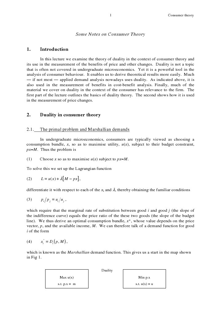 In this lecture we examine the theory of duality in the context of consumer theory and its use in the measurement of the benefits of price and other changes. Duality is not a topic that is often not covered in undergraduate microeconomics. Yet it is a powerful tool in the analysis of consumer behaviour. It enables us to derive theoretical results more easily. Much if not most applied demand analysis nowadays uses duality. As indicated above, it is also used in the measurement of benefits in cost-benefit analysis. Finally, much of the material we cover on duality in the context of the consumer has relevance to the firm. The first part of the lecture outlines the basics of duality theory. The second shows how it is used in the measurement of price changes.