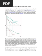 Sometimes Hicksian demand functions are also known as compensated demand functions, because the consumers utility is held constant when prices change and hence the consumer is compensated for them. This is shown in Fig 2. We reduce p1, as before, but instead of holding M constant, as we did when deriving the Marshallian demand function, we hold utility constant i.e. we keep the individual on indifference curve I0. This gives us budget line B3 and produces the optimal bundle shown as C. This lies to the right of A (given convexity of I0) but to the left of B (assuming x1 is normal). The move from A to C is, of course, the substitution effect. We can trace out the Hicksian demand function in the lower part of Fig 2. Point c corresponds to point C in the upper part of the diagram. We know that points a and c lie on the Hicksian demand curve corresponding to the utility level associated with I0. This Hicksian demand curve is labelled h10 . The slope of the Hicksian demand curve, Hi pi is the equal to the substitution effect. Well consider later the properties of the Hicksian demand function.