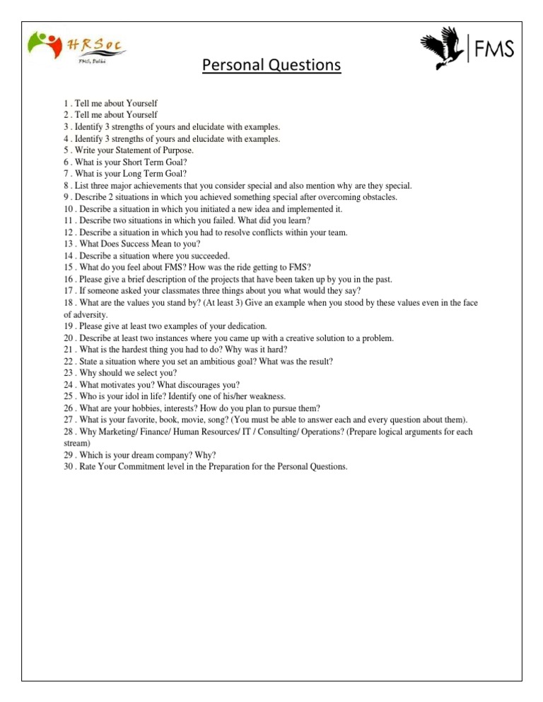 1 . Tell me about Yourself 2 . Tell me about Yourself 3 . Identify 3 strengths of yours and elucidate with examples. 4 . Identify 3 strengths of yours and elucidate with examples. 5 . Write your Statement of Purpose. 6 . What is your Short Term Goal? 7 . What is your Long Term Goal? 8 . List three major achievements that you consider special and also mention why are they special. 9 . Describe 2 situations in which you achieved something special after overcoming obstacles. 10 . Describe a situation in which you initiated a new idea and implemented it. 11 . Describe two situations in which you failed. What did you learn? 12 . Describe a situation in which you had to resolve conflicts within your team. 13 . What Does Success Mean to you? 14 . Describe a situation where you succeeded. 15 . What do you feel about FMS? How was the ride getting to FMS? 16 . Please give a brief description of the projects that have been taken up by you in the past. 17 . If someone asked your classmates three things about you what would they say? 18 . What are the values you stand by? (At least 3) Give an example when you stood by these values even in the face of adversity. 19 . Please give at least two examples of your dedication. 20 . Describe at least two instances where you came up with a creative solution to a problem. 21 . What is the hardest thing you had to do? Why was it hard? 22 . State a situation where you set an ambitious goal? What was the result? 23 . Why should we select you? 24 . What motivates you? What discourages you? 25 . Who is your idol in life? Identify one of his/her weakness. 26 . What are your hobbies, interests? How do you plan to pursue them? 27 . What is your favorite, book, movie, song? (You must be able to answer each and every question about them). 28 . Why Marketing/ Finance/ Human Resources/ IT / Consulting/ Operations? (Prepare logical arguments for each stream) 29 . Which is your dream company? Why? 30 . Rate Your Commitment level in the Preparation for the Personal Questions.