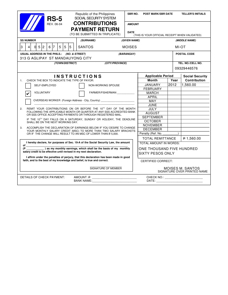 OVERSEAS WORKER (Foreign Address - City, Country) _______________________ _____________________________________________________________________ 2. REMIT YOUR CONTRIBUTIONS ON OR BEFORE THE 10TH DAY OF THE MONTH FOLLOWING THE APPLICABLE MONTH OR QUARTER AT ANY SSS ACCREDITED BANK OR SSS OFFICE ACCEPTING PAYMENTS OR THROUGH REGISTERED MAIL. IF THE 10TH DAY FALLS ON A SATURDAY, SUNDAY OR HOLIDAY, THE DEADLINE SHALL BE ON THE NEXT WORKING DAY. 3. ACCOMPLISH THE DECLARATION OF EARNINGS BELOW IF YOU DESIRE TO CHANGE YOUR MONTHLY SALARY CREDIT (MSC) TO MORE THAN TWO SALARY BRACKETS OR IF THE CHANGE WILL RESULT TO AN MSC OF LOWER THAN P 5,000. I hereby declare, for purposes of Sec. 19-A of the Social Security Law, the amount of ______________________________________________________________________ (P ____________ ) as my monthly earnings, which shall be the basis of my monthly salary credit to be effective until revised in my next declaration. I affirm under the penalties of perjury, that this declaration has been made in good faith, and to the best of my knowledge and belief, is true and correct. ______________________ SIGNATURE OF MEMBER