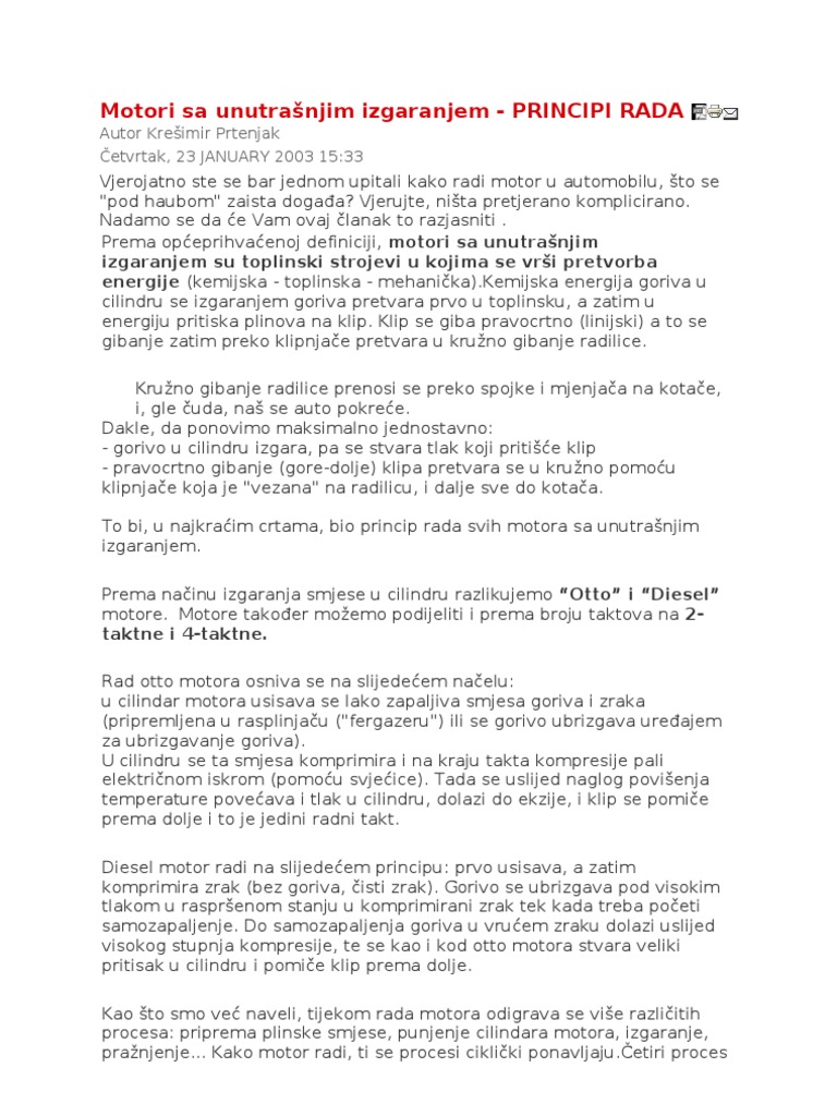 koristili na razne naine da nas prevezu, ali vremenom niti to nije bilo dovoljno... - Parni stroj - Nije preostalo nita nego napraviti neki stroj koji nas moe prevesti dovoljno daleko i brzo. Rije \"dovoljno\" treba shvatiti uvjetno. Prvi stroj koji je pokretao prijevozna sredstva bio je parni stroj. Ali, imao je dvije velike mane, koje su ga na kraju i istisnule iz upotrebe. -izrazito mali stupanj iskoristivosti (omjer energije uloene putem gorive i efektivno dobivene energije-da pojednostavnimo, veliku potronju goriva) -velike dimenzije Tada stupaju na povijesnu scenu motori sa unutranjim izgaranjem, koji su se odrali sve do dananjih dana (kako sada stvari stoje, jo bar neko vrijeme nee izai iz upotrebe). Teko je predvidjeti kako e izgledati pogonska sredstva u budunosti, ali unato silnim istraivanjima alternativnih izvora energije i pogonskih strojeva koji bi koristili tu energiju, nema ozbiljnije konkurencije motorima sa unutranjim izgaranjem. Prvi motor principijelno slian dananjima, konstruirao je 1860. godine Lenoir (poznat je kao Lenoir-ov motor). Sasvim je suvino govoriti o upotrebnoj vrijednosti tog motora, ali ipak ga pamtimo kao prvi motor koji je uspio u praksi provesti teorijska naela rada motora sa unutranjim sagorijevanjem. 1870 godine njemaki inenjer Nicholas August Otto konstruirao je motor, kojeg je nazvao atmosferski motor. Stupanj iskoristivosti tog motora za dananje pojmove bio je vrlo malenih cca. 12%, a kao gorivo je koristio rasvjetni plin. - Otto motor - Kao godinu kljunu za razvoj dananjih Otto motora, moramo spomenuti 1885. godinu. Te su godine, paralelno i nezavisno Gottlieb Daimler i Carl Maybach te Carl Friedrich Benz konstruirali motore sa vanjskim izvorom zapaljenja smjese (svjeica, koja dobiva energiju od akumulatora) i unutranjim izgaranjem iste. Takve motore danas nazivamo Otto motori. Vanjski izvor zapaljenja smjese nije se pokazao kao najsretnije rjeenje; bio je uzrok velikih problema i estih kvarova. - Diesel motor - 1897. godine mladi njemaki inenjer Rudolf Diesel konstruirao je prvi motor sa unutranjim izgaranjem, ali bez zapaljenja smjese iskrom. Na kraju kompresijskog takta u motor se ubrizgava gorivo (plinsko ulje) koje sa tada pali samo uslijed visokog tlaka i temperature. Takav motor danas poznajemo kao \" DIESEL\" motor Moda je jo zanimljivo istaknuti da se u zadnjih 20-tak godina razvojem klipnih motora sa unutranjim izgaranjem, u prosjeku zagaenje emisijom ispunih plinova smanjilo cca. 50 puta. To se dogodilo uglavnom zahvaljujui zelenima (inenjere naravno po obiaju nitko ne spominje) i njihovim zabludama da su automobili najvei zagaivai, to ni najmanje ne odgovara stvarnom stanju, ali o tome nekom drugom prilikom. Konstrukcijski gledano, motori se u zadnjih 50-tak godina nisu puno mijenjali. Bolje performanse postignute su uglavnom razvojem materijala i tehnologija. Poveana su dozvoljena mehanika i toplinska naprezanja materijala, i naravno, u zadnjih 15-tak godina, i tu je ula svemona elektronika,