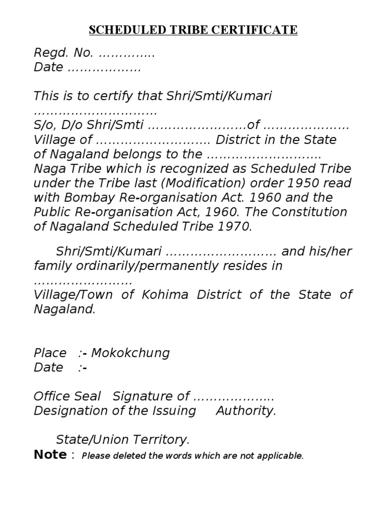 This is to certify that Shri/Smti/Kumari S/o, D/o Shri/Smti of Village of . District in the State of Nagaland belongs to the . Naga Tribe which is recognized as Scheduled Tribe under the Tribe last (Modification) order 1950 read with Bombay Re-organisation Act. 1960 and the Public Re-organisation Act, 1960. The Constitution of Nagaland Scheduled Tribe 1970. Shri/Smti/Kumari and his/her family ordinarily/permanently resides in Village/Town of Kohima District of the State of Nagaland. Place Date :- Mokokchung :-