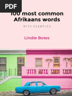 langs next to langsaan next door lanklaas a long time ago later later lawaai noise Ie lay, lie down leef live leer teach, learn leerware leatherware lees read leeu lion leeuwyfie lioness leier leader lek (n) puncture lekker nice, pleasant, sweet (n) lekkers sweets lektor lecturer lelik ugly lemmetjie lime lemoen orange lemoenblaar orange leaf lemoensous orange sauce lengte length lening loan lente spring lepel spoon les lesson letterkunde literature leunstoelsportmense armchair sportsmen lewe life lewendig lively, alive lewensvatbaar viable lewenswyse lifestyle lewer (v) produce, deliver lid member liefde love liewer rather lig light liggaam body ligroos, pienk pink linne linen links left lipstiffie lipstick liter litre 10k attract longkwaal lung disease loop go, walk los loose lourierblaar bay leaf lug air lugpos airmail lui ring (v), lazy (a) luiperd leopard luister listen luukse luxury (n), luxurious (a) Ius he feel like Iyf body Iyk look Iys list ma mother maag stomach maak make maak gou hurry up maal (v) mince maalgat pot-hole maaltyd meal maand month Maandag Monday maar but Maart March maatjie companion maer skinny, thin mag may maklik easy maksimum maximum maloor mad about man man, husband mango (veselperske) mango manier manner manlik masculine, male manshaarkapper barber mansklere men's clothing mark market masker mask massa mass mat carpet matig mild, moderate matrikulasiesertifikaat matriculation certificate matrikuleer matriculate matrone matron mediese medical medisyne medicine medium medium meegevoel sympathy meenthuis town house meer more meeste most meesterwerk masterpiece Mei May meisie girl, girlfriend mejuffrou, juffrou Miss mekaar each other meld state (v) melk milk memorandum memorandum meneer (mm.) Mr meng mix menigte crowd mening, opinie opinion mens person menslike human merrie mare mes knife messegoed cutlery met with meter metre meubels furniture meubelwinkel furniture store mevrou (mev.) Mrs middag afternoon middestad city centre mielies mealies milliliter millilitre millimeter millimetre min little minuut minute (n) miskien perhaps miskolle fog patches modeontwerpster fashion designer modem modern modewinkel fashion boutique moedeloos despondent moeg tired moeilik difficult