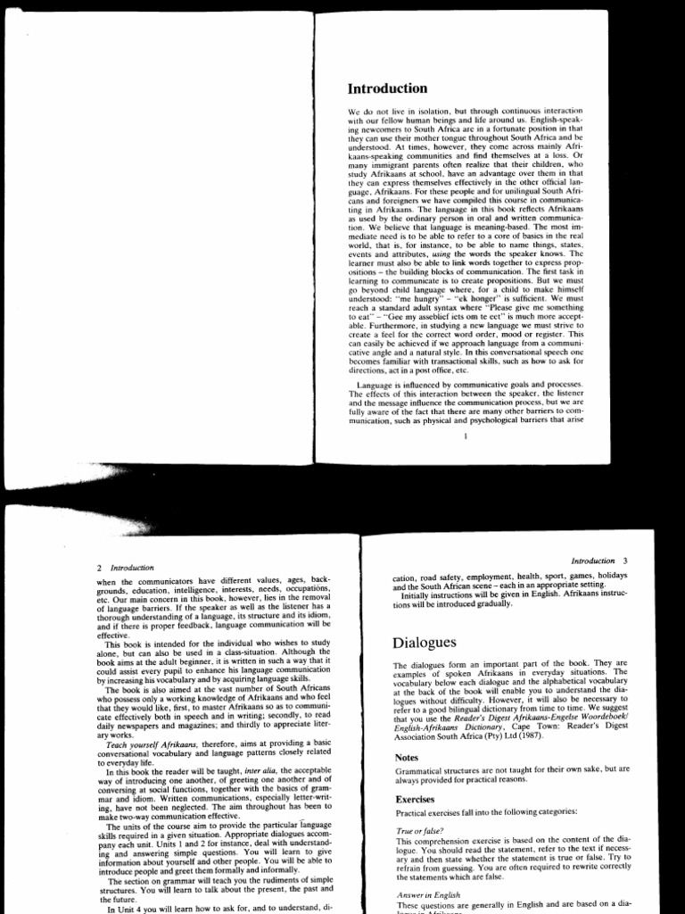 The dialogues form an important part of the book. They are examples of spoken Afrikaans in everyday situations. The vocabulary below each dialogue and the alphabetical vocabulary at the back of the book will enable you to understand the dialogues without difficulty. However, it will also be necessary to refer to a good bilingual dictionary from time to time. We suggest that you use the Reader's Digest Afrikaans-Engelse Woordeboek/ English-Afrikaans Dictionary, Cape Town: Reader's Digest Association South Africa (Pty) Ltd (1987).