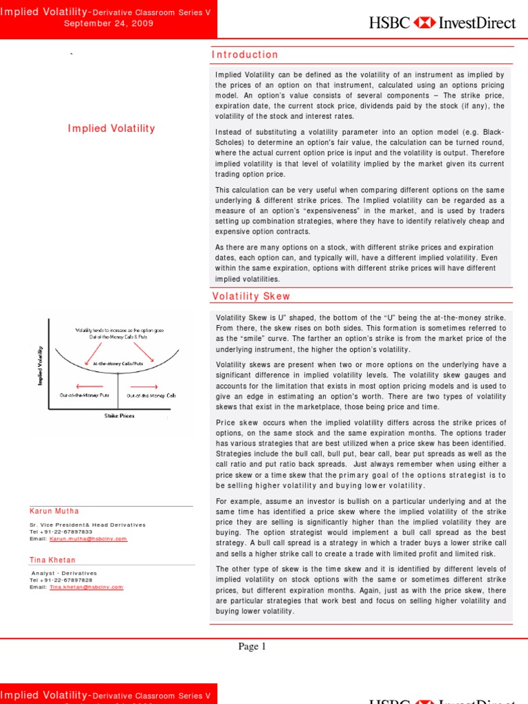Volatility Skew is U shaped, the bottom of the U being the at-the-money strike. From there, the skew rises on both sides. This formation is sometimes referred to as the smile curve. The farther an options strike is from the market price of the underlying instrument, the higher the options volatility. Volatility skews are present when two or more options on the underlying have a significant difference in implied volatility levels. The volatility skew gauges and accounts for the limitation that exists in most option pricing models and is used to give an edge in estimating an option's worth. There are two types of volatility skews that exist in the marketplace, those being price and time. Price skew occurs when the implied volatility differs across the strike prices of options, on the same stock and the same expiration months. The options trader has various strategies that are best utilized when a price skew has been identified. Strategies include the bull call, bull put, bear call, bear put spreads as well as the call ratio and put ratio back spreads. Just always remember when using either a price skew or a time skew that the primary goal of the options strategist is to be selling higher volatility and buying lower volatility. For example, assume an investor is bullish on a particular underlying and at the Karun Mutha