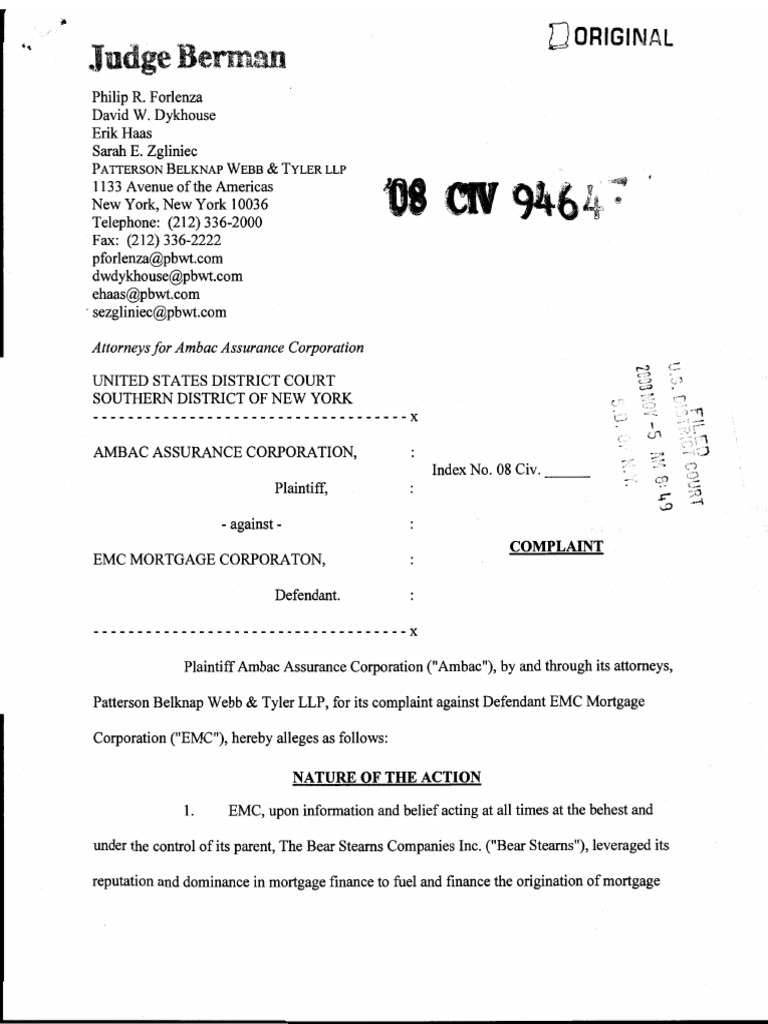 AMBAC v EMC Mortgage Et Al., USDC Southern District of New York - 110508 091754 - 08-CV-9464. You may read more about this case and my analysis at my blog, The Subprime Shakeout, at http://subprimeshakeout.blogspot.com/search/label/Ambac.